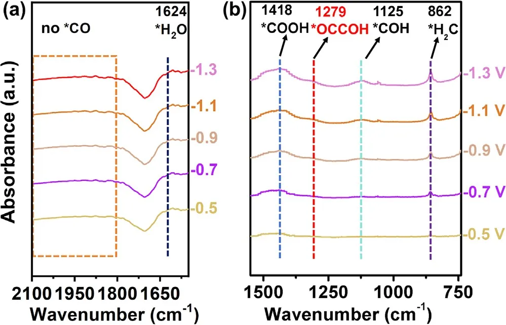 图6 Cu-MOF/CuₓO/CF-40催化剂在-0.5~ -1.3 V (vs RHE) 不同电位下ECO₂RR的原位ATR-FTIR光谱。