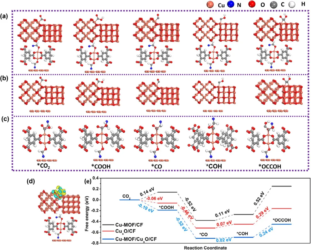 图7 ECO₂RR制C₂产物的DFT计算。(a) Cu-MOF/CuₓO/CF-40,(b) CuₓO/CF,和 (c) Cu-MOF/CF的催化剂结构。(d) CO₂在Cu-MOF/CuₓO/CF-40表面吸附的差分电子密度图,其中黄色和蓝色区域分别代表电子聚集和耗尽。(e) ECO₂RR在Cu-MOF/CuₓO/CF-40(蓝色)、CuₓO/CF(红色)和 Cu-MOF/CF(黑色)上生成 C₂产物的反应路径的DFT计算。