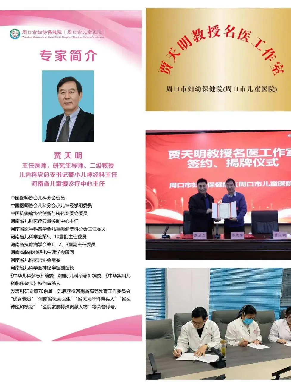 同时与郑州大学第三附属医院(河南省妇幼保健院)贾天明教授合作成立名医工作室一间,贾天明教授定期于我院坐诊、科室查房、组织参加科内疑难病例讨论等。