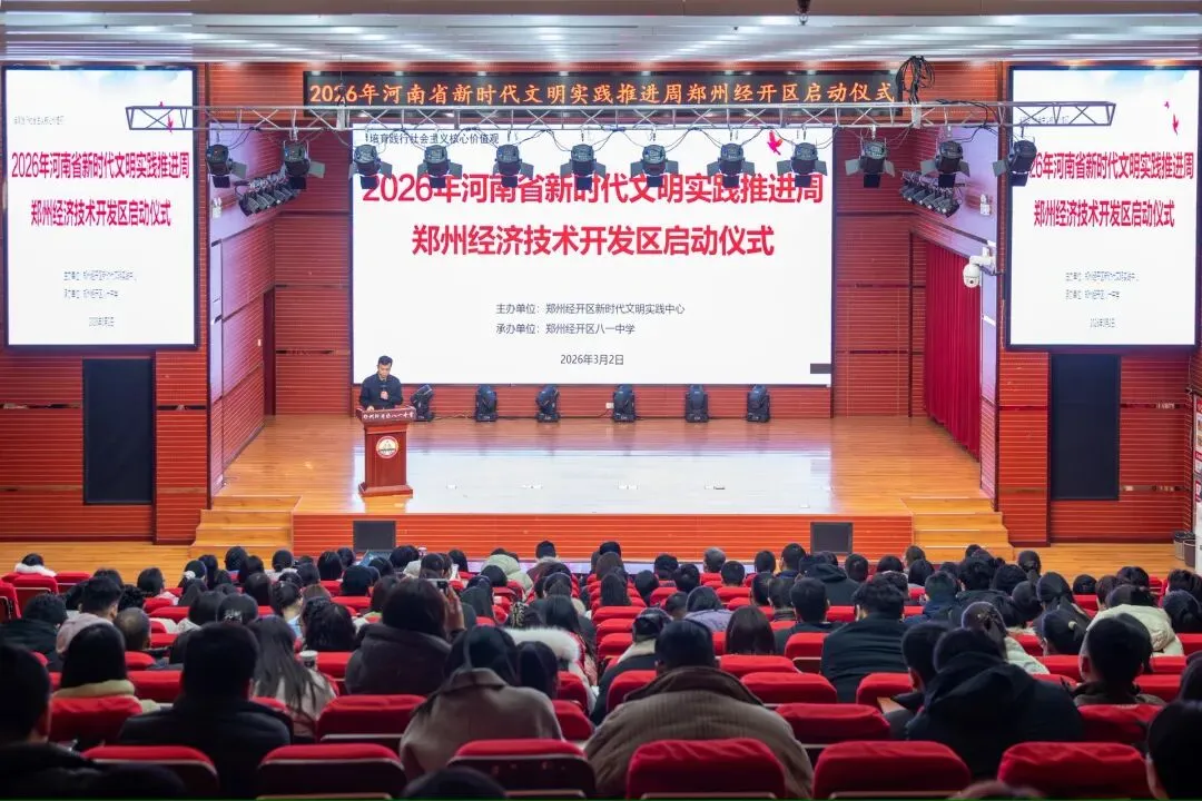 3月2日,由郑州经开区新时代文明实践中心主办的2026年“新时代文明实践推动周”启动仪式在八一中学报告厅举行。郑州经开区一级调研员游广顺出席并宣布活动启动,全国道德模范代表李江福作首场理论宣讲。