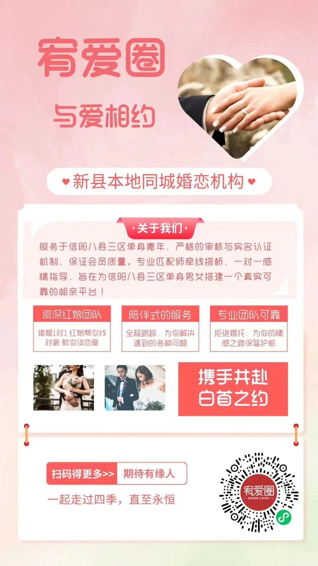 宥爱圈婚恋平台拥有专业的婚恋服务,优秀的红娘队伍以及诚信会员验证体系,提供“一对一”线下高品质婚恋服务及线上交友小程序。宥爱圈帮助你打破原本的社交圈,遇见同城更多优质的单身男女,帮助更多的信阳人脱单。