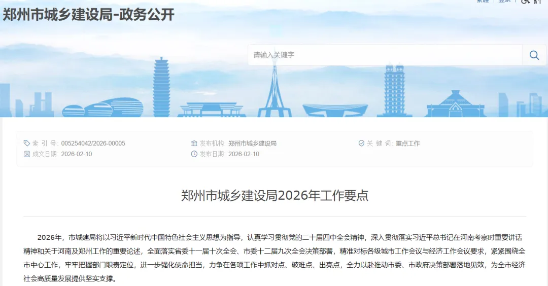 2月11日郑州市城乡建设局公布2026年工作要点。其中提到: