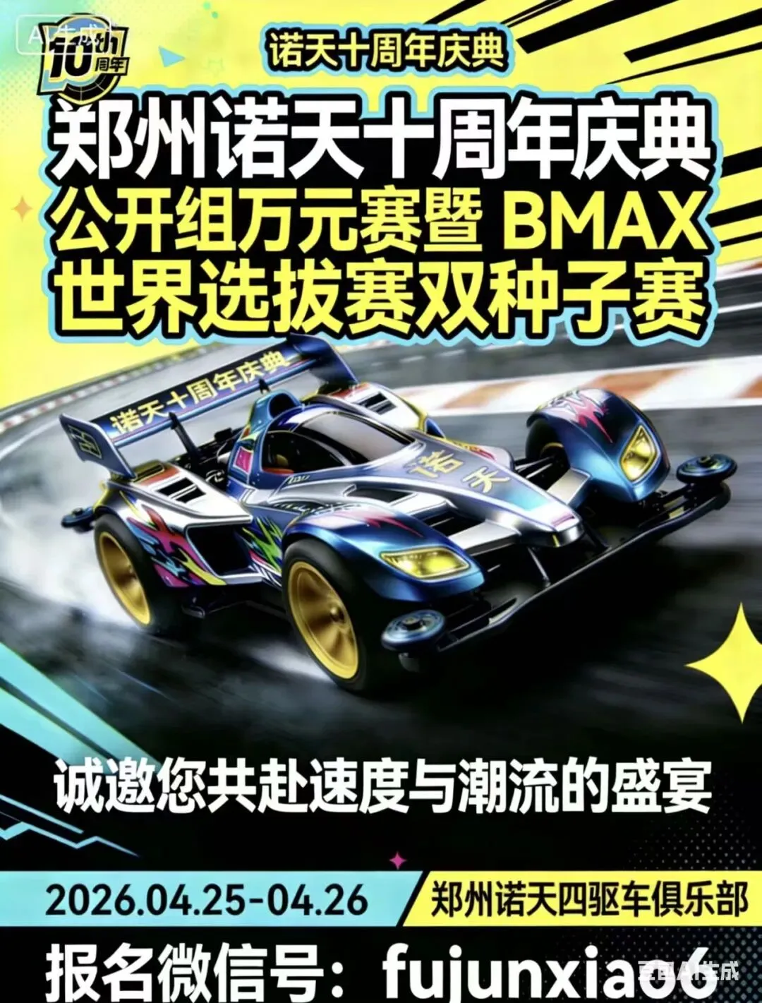 郑州诺天即将迎来十周年荣耀庆典,以迷你四驱车为纽带,打造一场竞速盛宴,现正式向全国四驱车爱好者发出诚挚邀约!