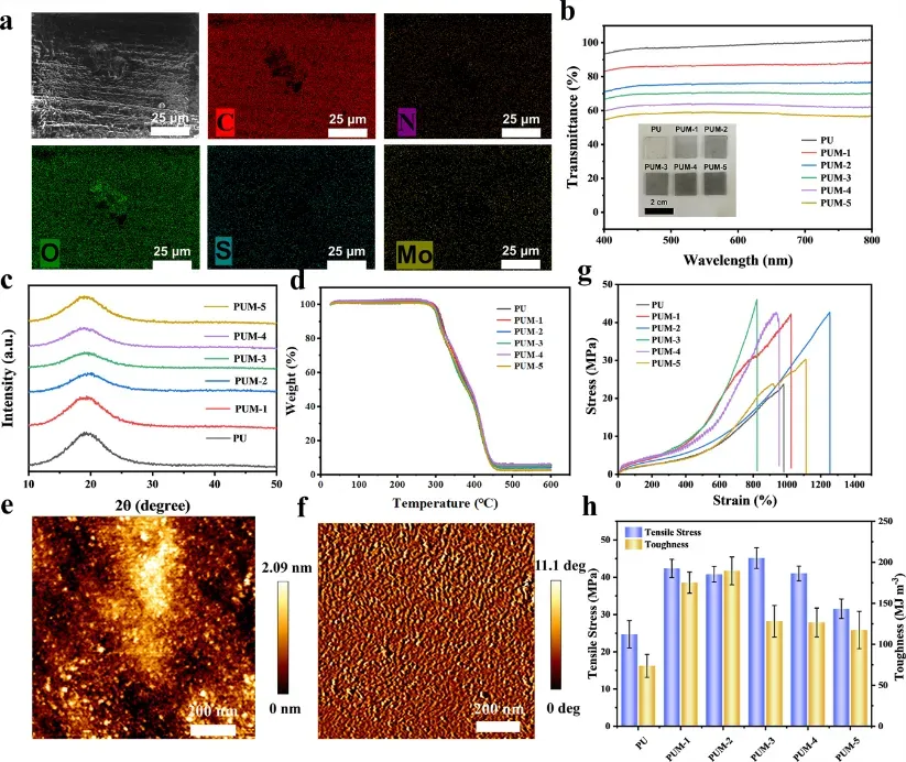 1. 优异的综合力学性能:通过优化MoO₂的掺杂量(如0.04 wt%的PUM-2样品),材料展现出令人印象深刻的机械性能组合:拉伸强度高达40.8 MPa,断裂伸长率突破1225.5%,韧性更是达到了惊人的189.6 MJ m⁻³。这种“既强又韧”的特性得益于均匀分布的MoO₂颗粒起到了刚性增强点的作用,同时其与聚氨酯基体间的界面氢键和物理吸附优化了应力传递。