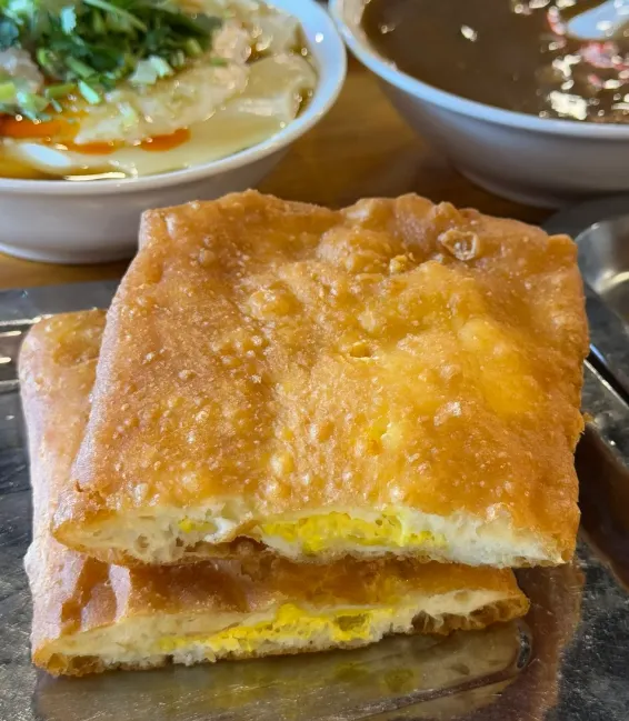 必试项:鸡蛋布袋。这玩意儿简直是碳水爱好者的福音。油条炸得鼓鼓囊囊的,把鸡蛋液灌进去再复炸。外皮金黄酥脆,咬下去“咔嚓”一声,里面的鸡蛋嫩得流油,滚烫的香气“呲”一下冒出来,烫得你直吸气,却又舍不得停嘴。