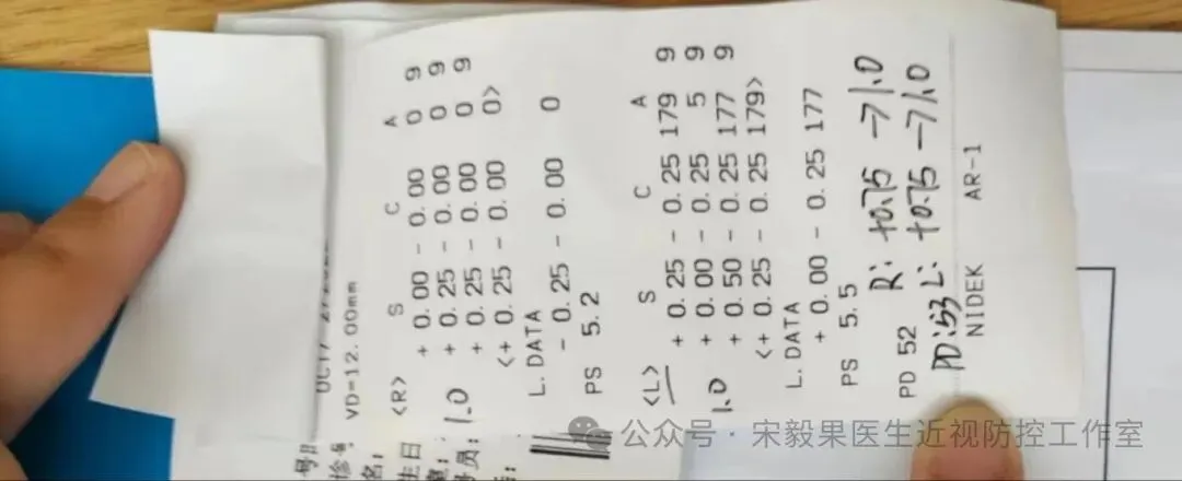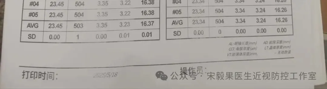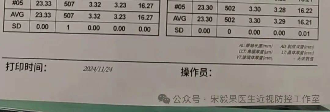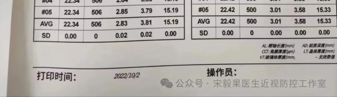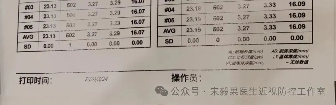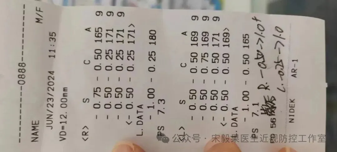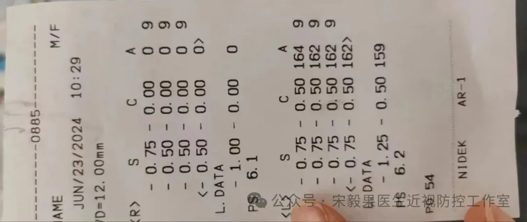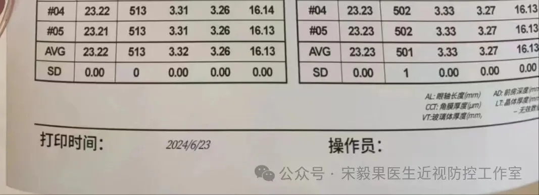 2024.6.23(24.2.10戴离焦眼镜)郑州某院检查,电脑验光:右眼-0.50DS,-0.0DC*180,左眼-0.750DS,-0.5DC*170;散瞳验光:右眼-0.50DS,-0.250DC*180,左眼-0.50DS,-0.5DC*170;眼轴:右眼:23.22mm,左眼,23.23mm,