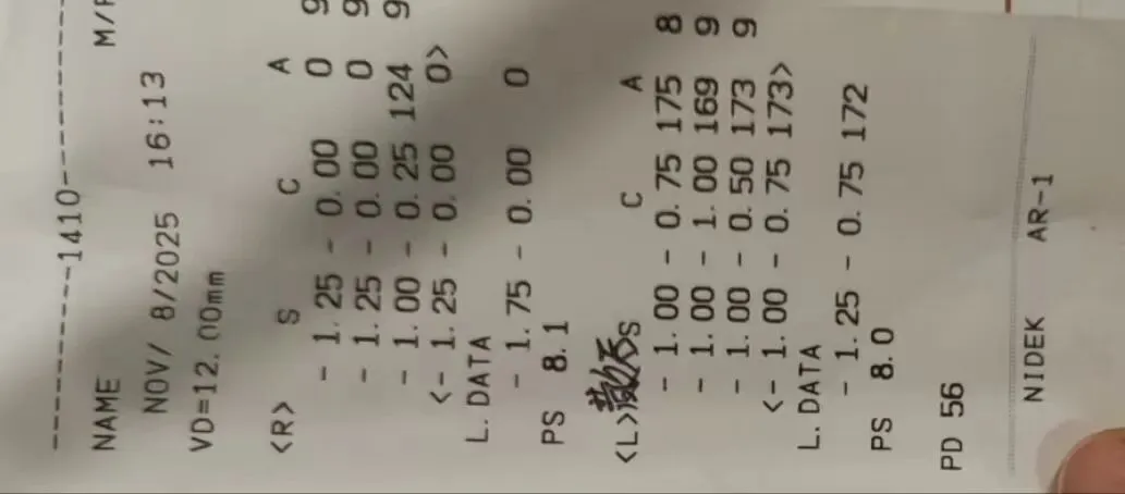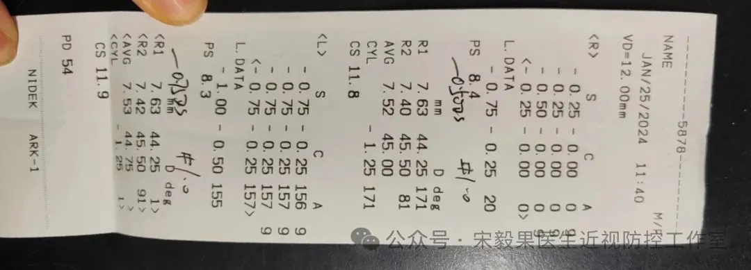 2025.2.11(24.2.10戴离焦眼镜)郑州某院检查,电脑验光:右眼-1.250DS,-0.0DC*180,左眼-1.250DS,-0.25DC*170;眼轴:右眼:23.44mm,左眼,23.43mm,