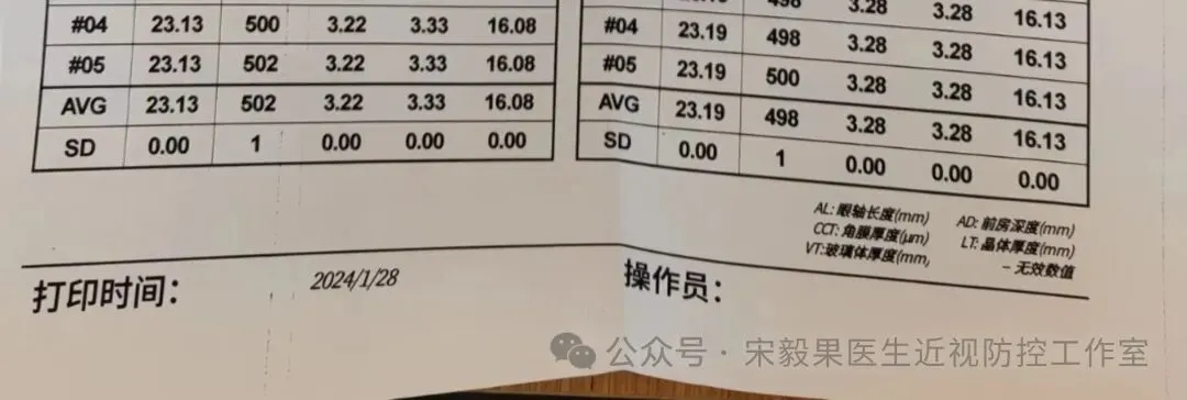 2024.1.28郑州某院检查,医学验光:右眼-0.5DS→1.0,左眼-0.75DS→1.0;眼轴:右眼:23.13mm,左眼,23.19mm,