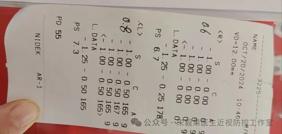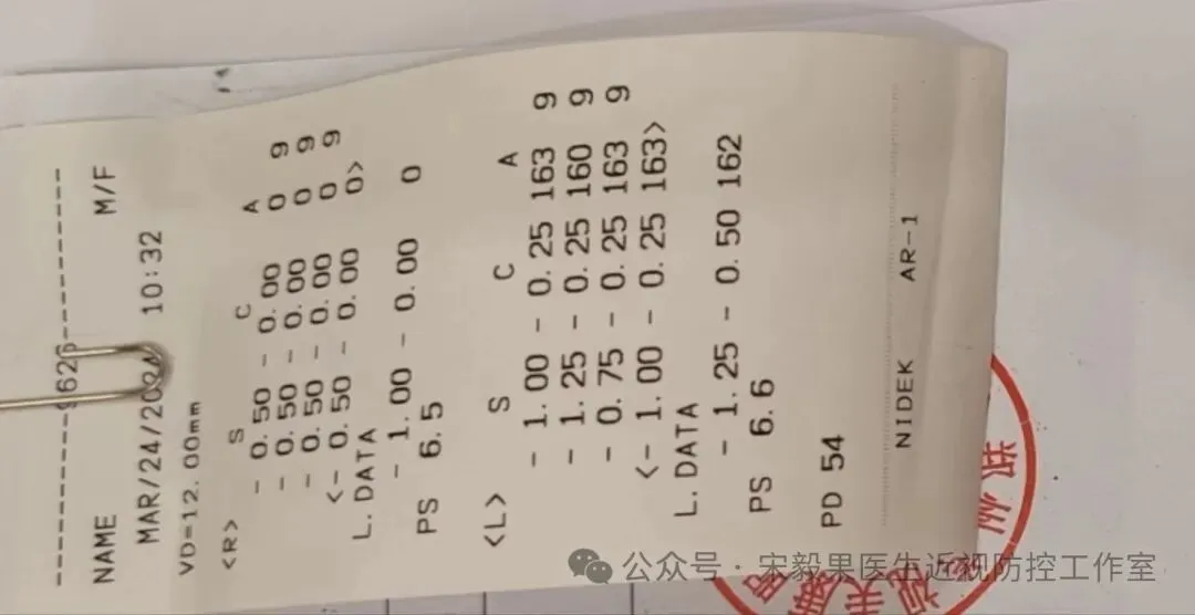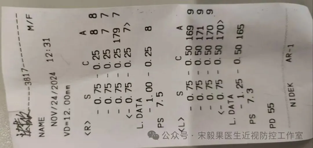 2024.3.24(24.2.10戴离焦眼镜)郑州某院检查,电脑验光:右眼-0.50DS,-0.0DC*180,左眼-1.0DS,-0.25DC*170;眼轴:右眼:23.13mm,左眼,23.19mm,