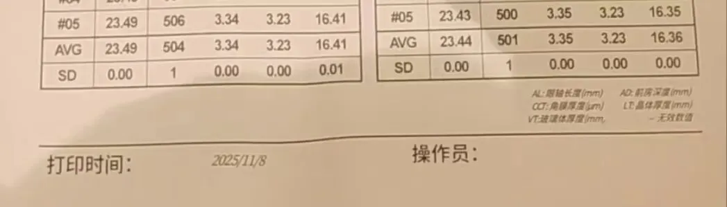 2025.11.8(24.2.10戴离焦眼镜,2025.5.18针对性训练)郑州某院检查,散瞳验光:右眼-1.250DS,-0.0DC*180,左眼-1.0DS,-0.75DC*170;眼轴:右眼:23.49mm,左眼,23.44mm,