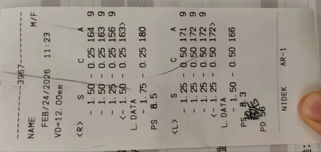 右眼增加100度,左眼涨50度,总结:25个月(2024.1.28-2026.2.24)屈光变化,眼轴变化:右眼增加0.5,左眼增加0.32。医学验光:右眼-0.5DS→1.0,左眼-0.75DS→1.0;眼轴:右眼:23.13mm,左眼,23.19mm,