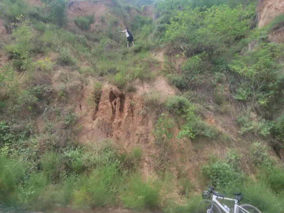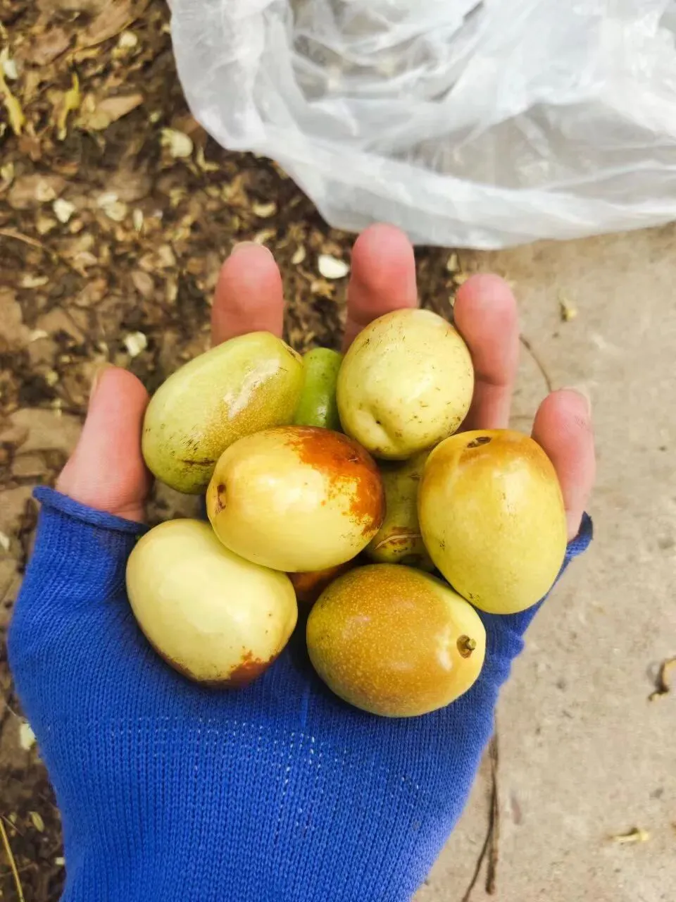 出孟津,过偃师,途经巩义康店镇一个村子时,猜猜我们发现了啥?马路边掉落着一颗吃剩下的大青枣,一抬头,嚯!路边的小山坡儿零零散散长着几棵野枣树。我找了一根树枝摘了几颗,果大肉圆,甜中带酸。小雨撸起袖子,直接爬到土坡上。
