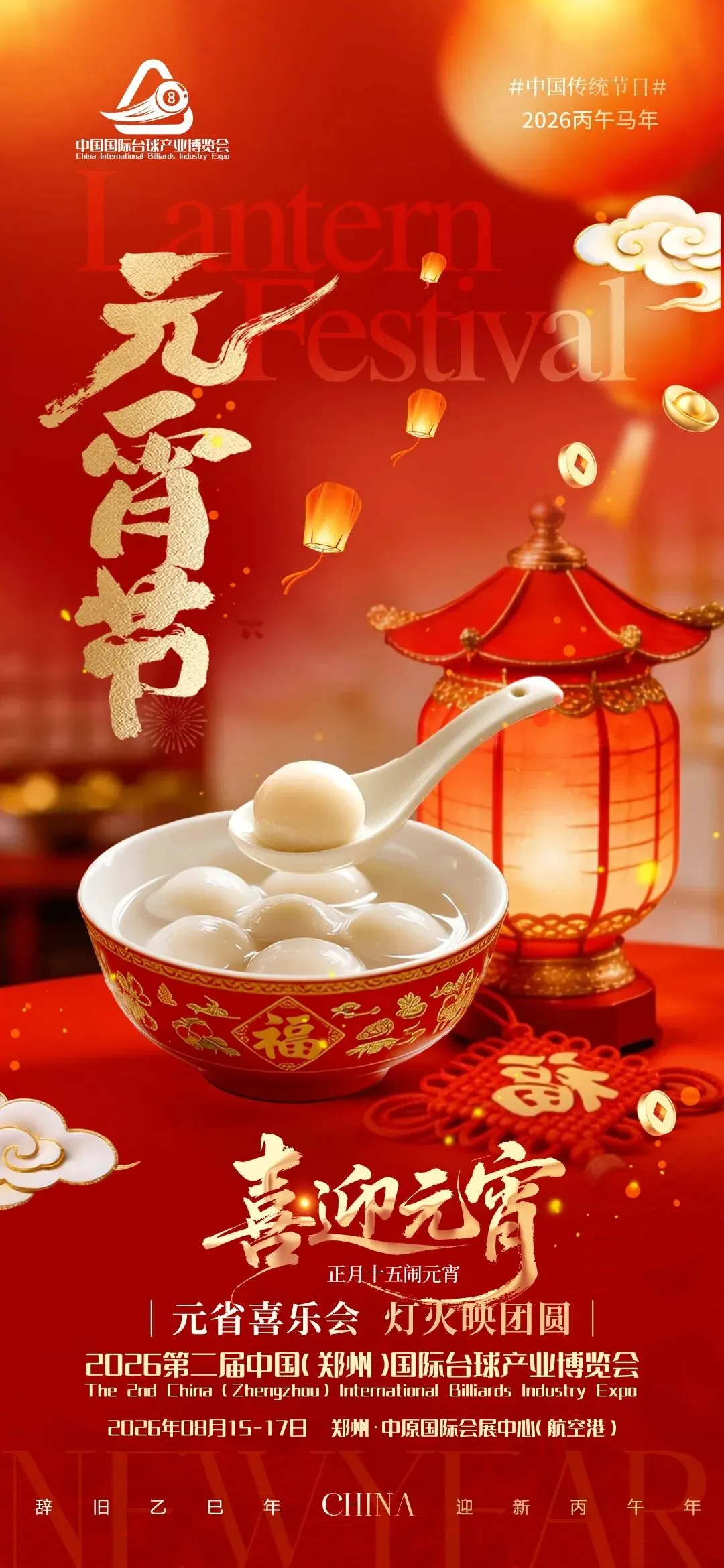 灯火映佳节,月圆赴新程。值此马年元宵佳节,壹肆柒·2026第二届郑州台球展向全国台球行业同仁、参展伙伴、各地采购商致以诚挚祝福。