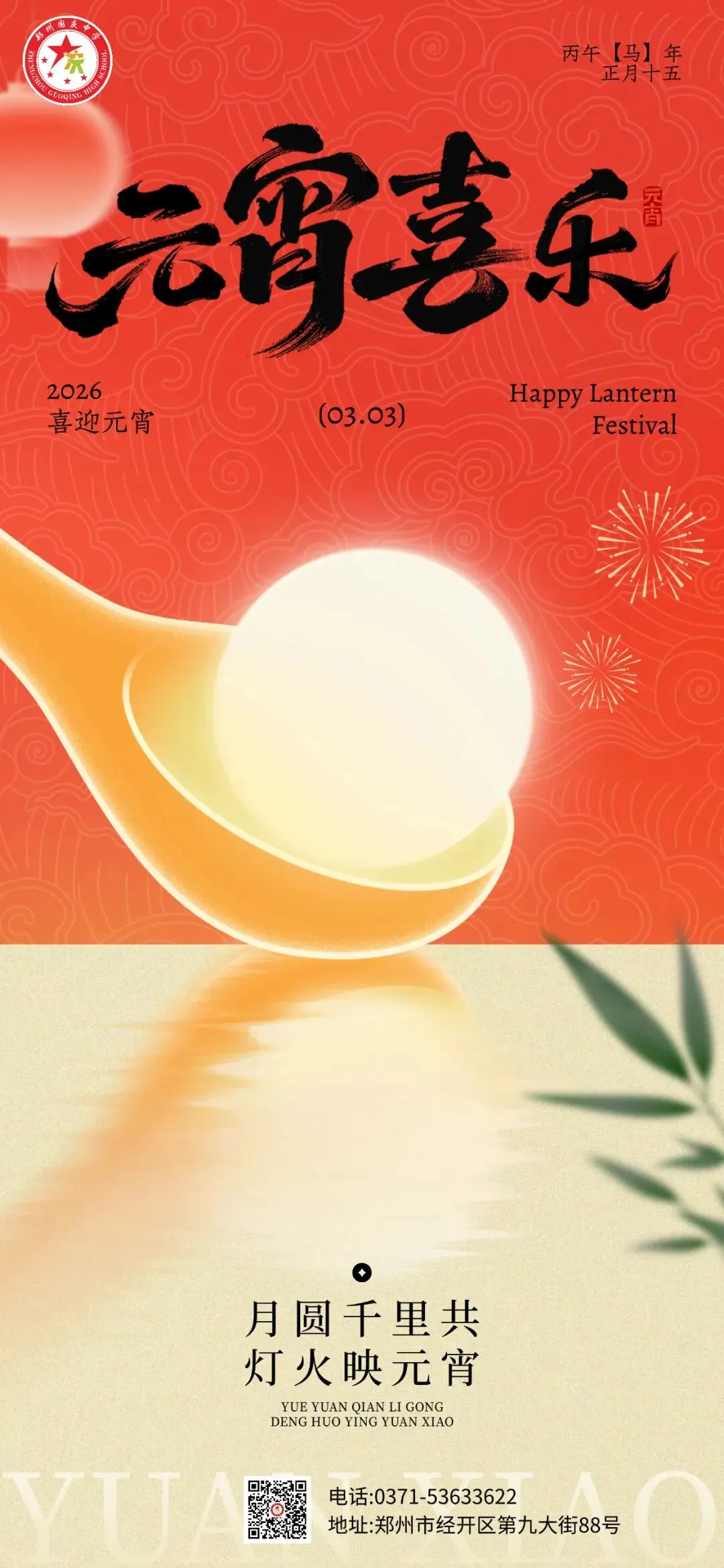 正月十五元宵到,吃汤圆,元宵佳节万家团圆,事事团圆。郑州国庆中学恭祝您:阖家团圆!健康顺遂!万事如意!元宵节快乐!
