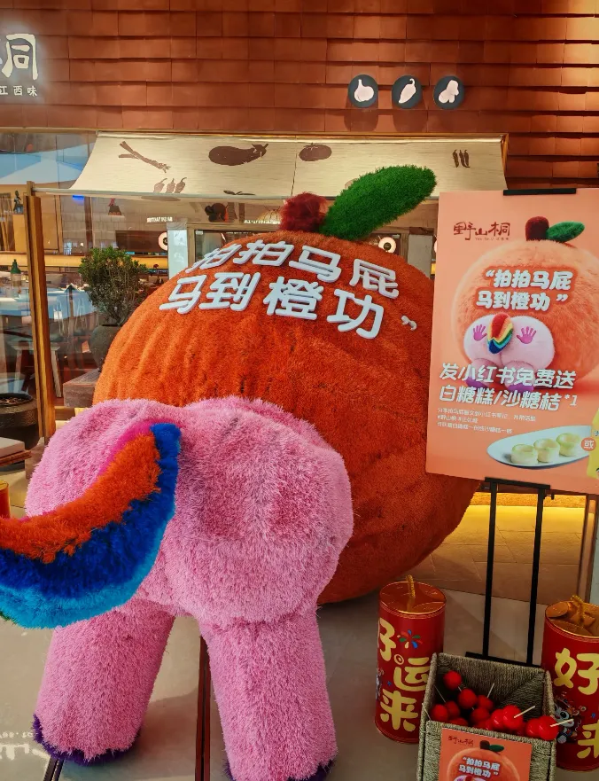如果说金融岛是都市浪漫,那正弘城就是市井潮趣。野山桐餐厅门口,巨型橙色毛绒马臀装置成为全场焦点,“拍拍马屁,马到橙功”的谐音梗俏皮又暖心,旁边立牌写着“发小红书打卡,免费送白糖糕、沙糖桔”,把豫式年味与潮流打卡完美融合。