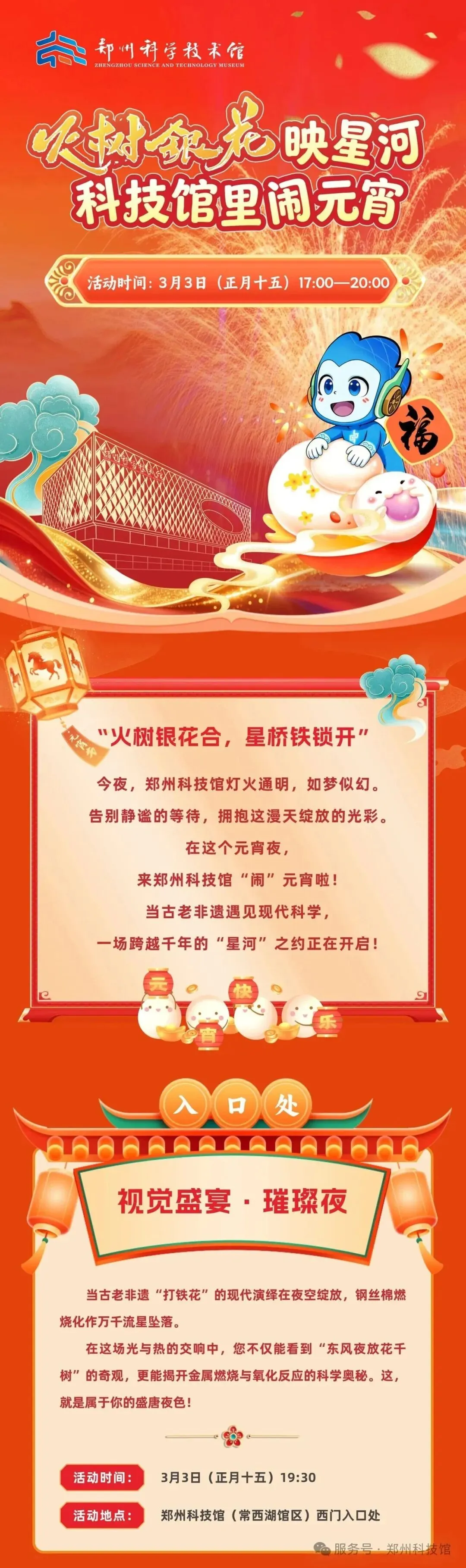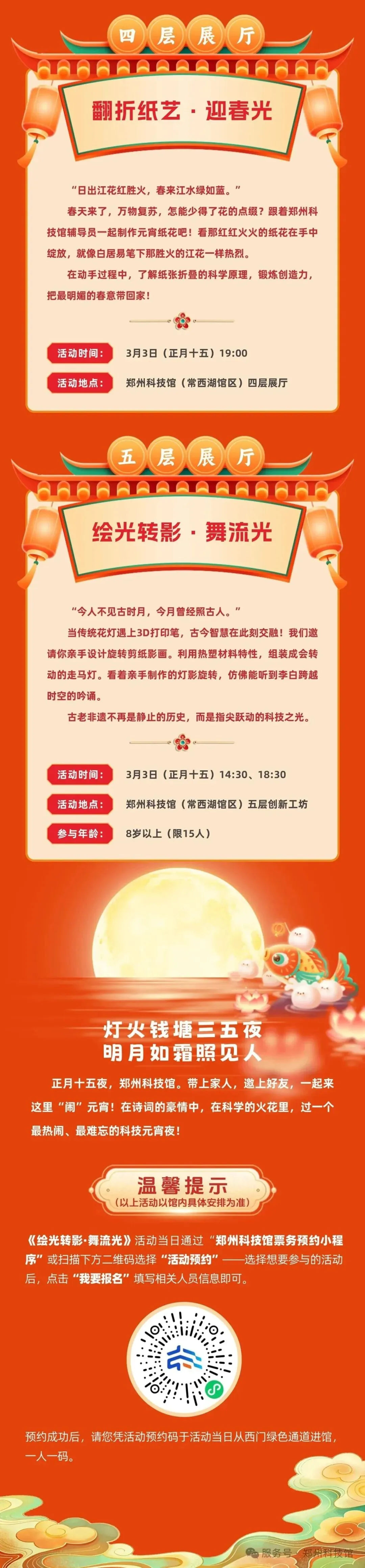 2.儿童科学乐园场次安排:元宵节当天新增预约场次17:30——20:00,名额400人。