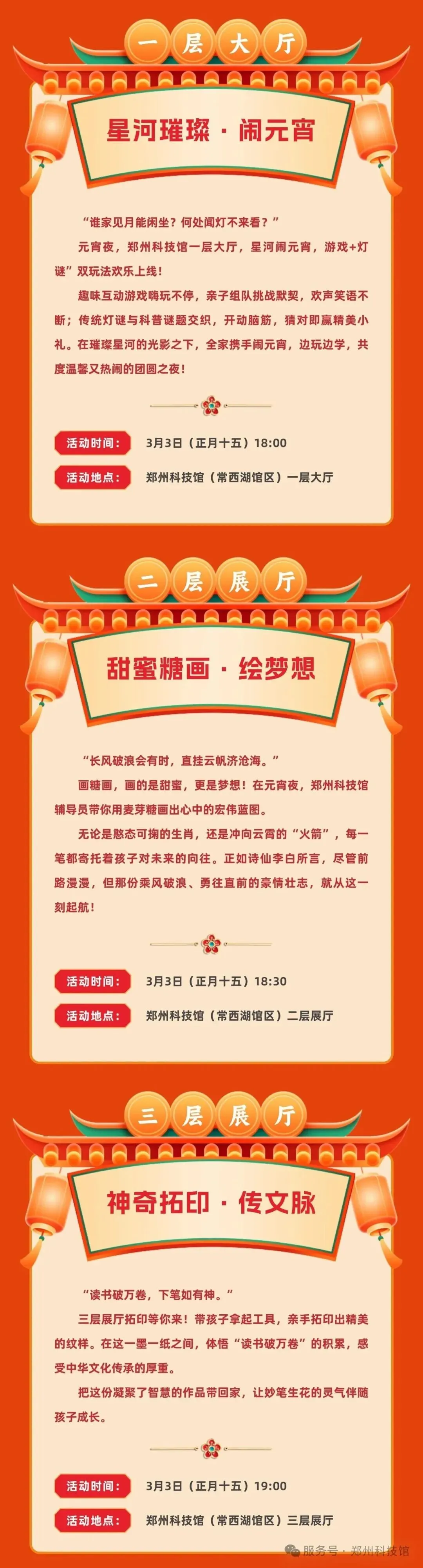 为喜迎元宵佳节,郑州科学技术馆(常西湖馆区)增加3月3日(正月十五)预约场次、延长开放时间,具体安排如下: