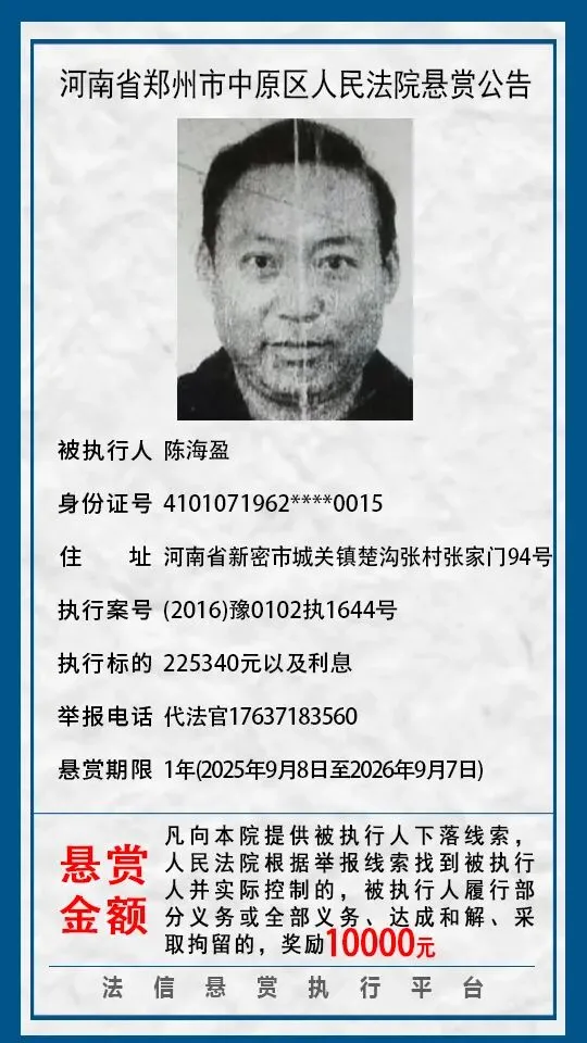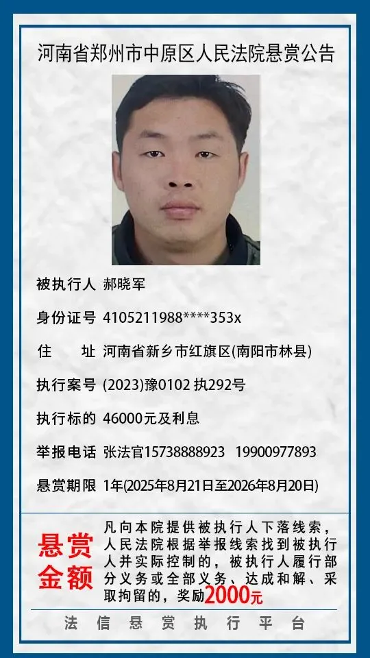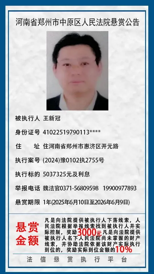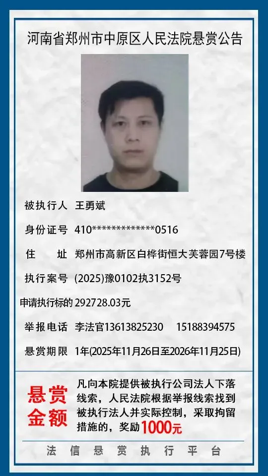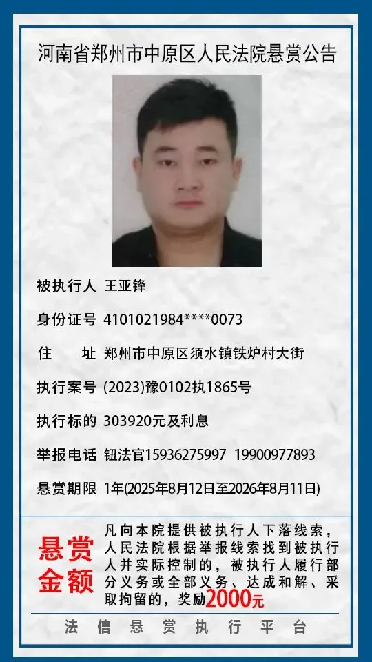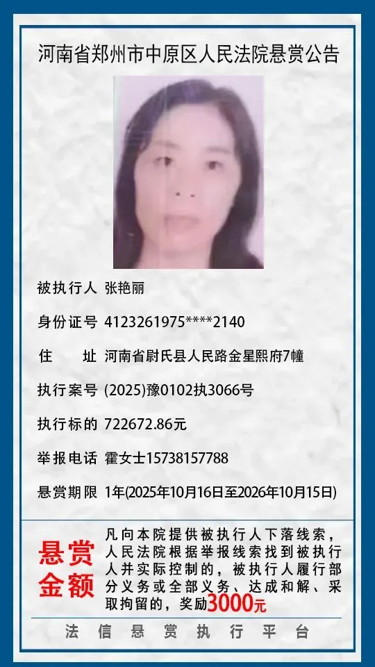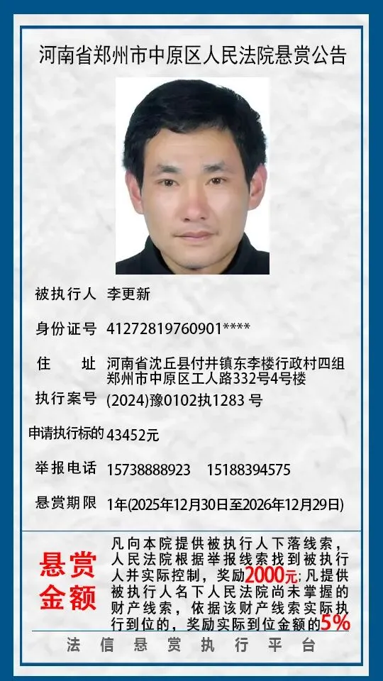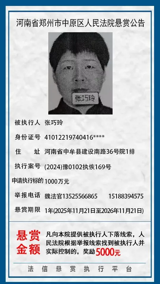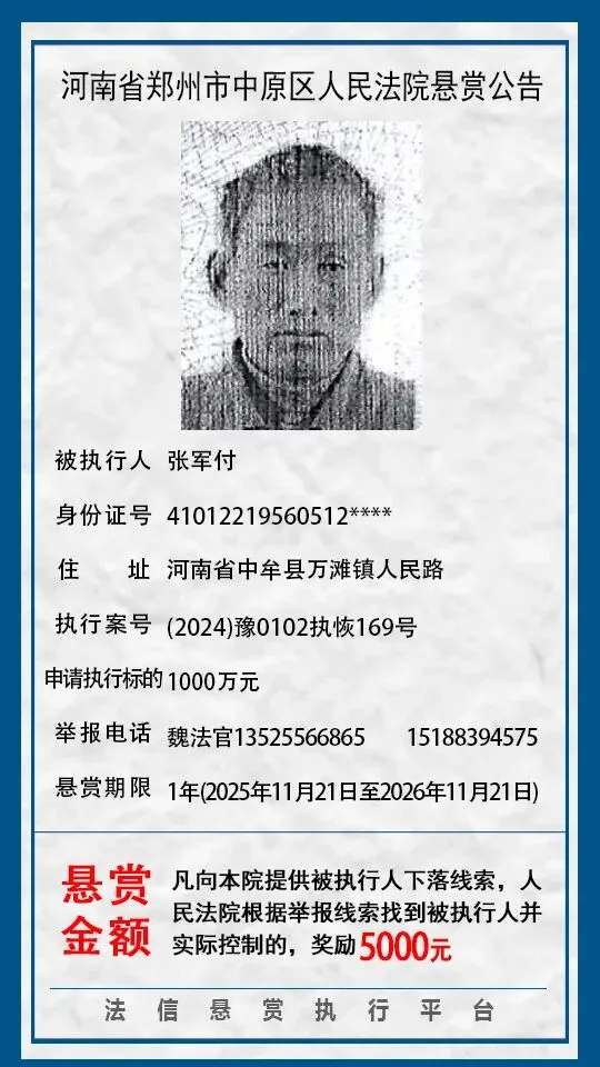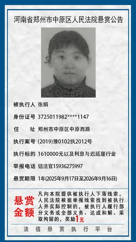 河南省郑州市中原区人民法院悬赏公告(2025年2月-2026年1月汇总)