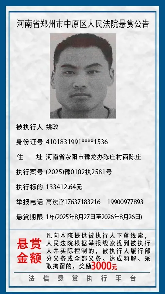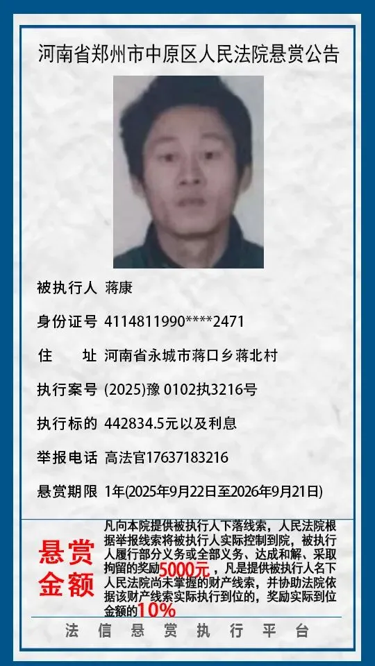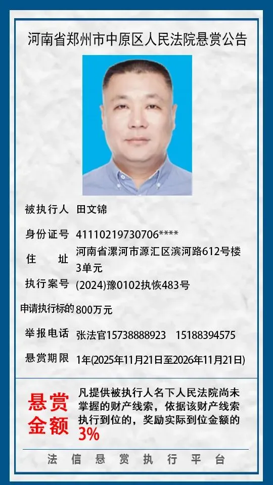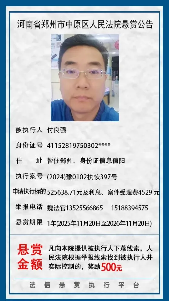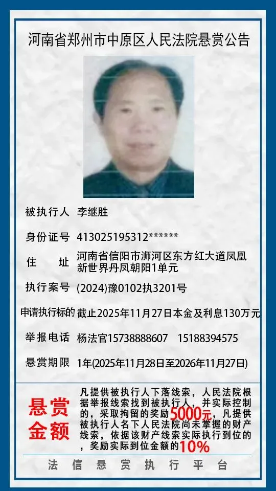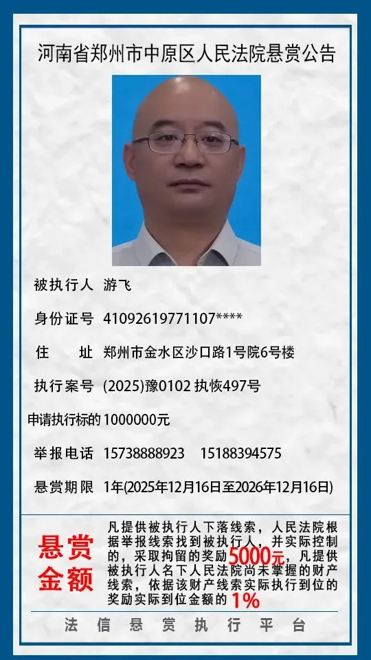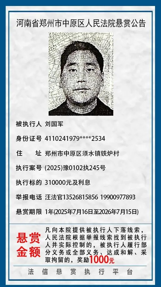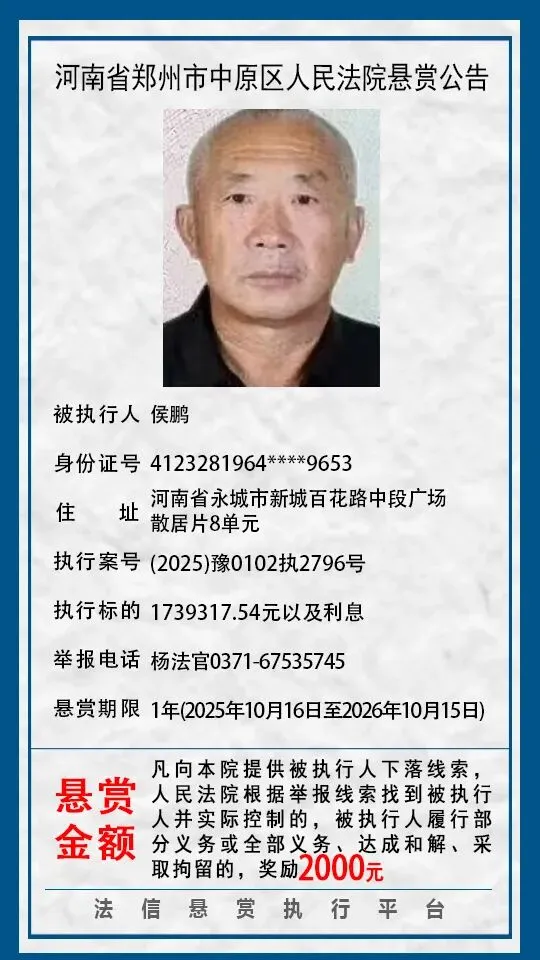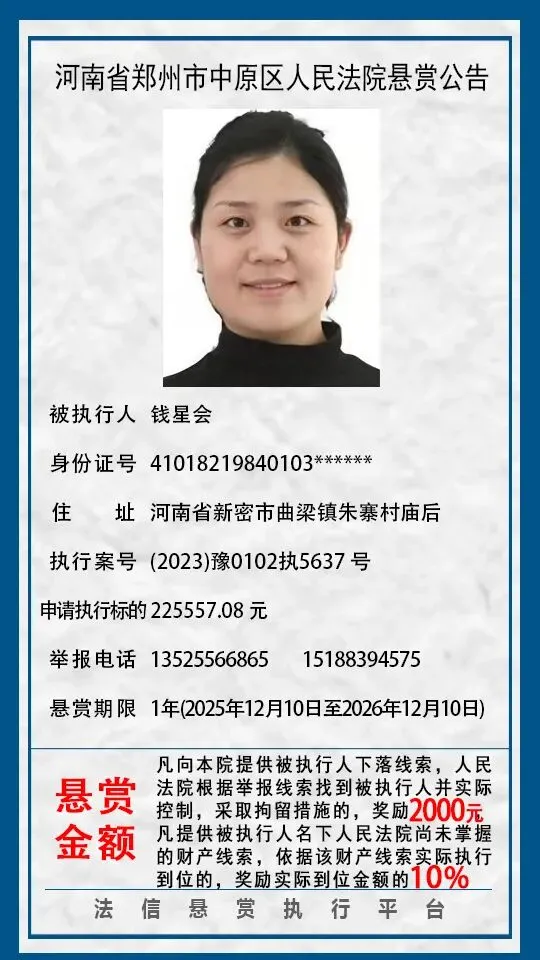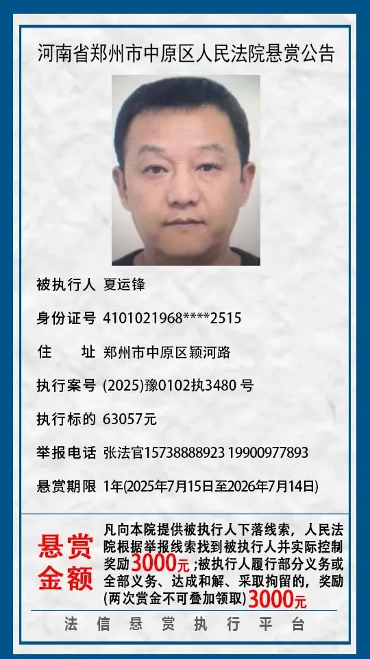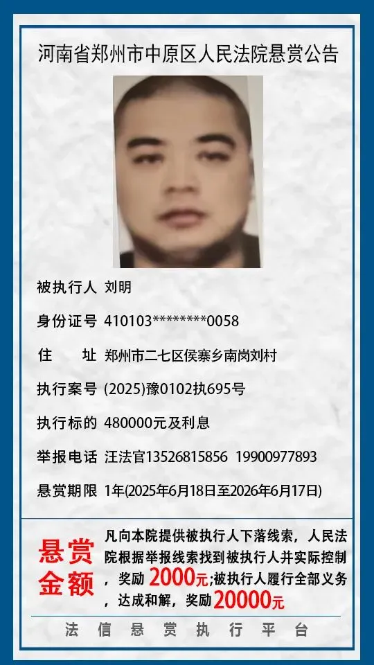 河南省郑州市中原区人民法院悬赏公告(2025年2月-2026年1月汇总)