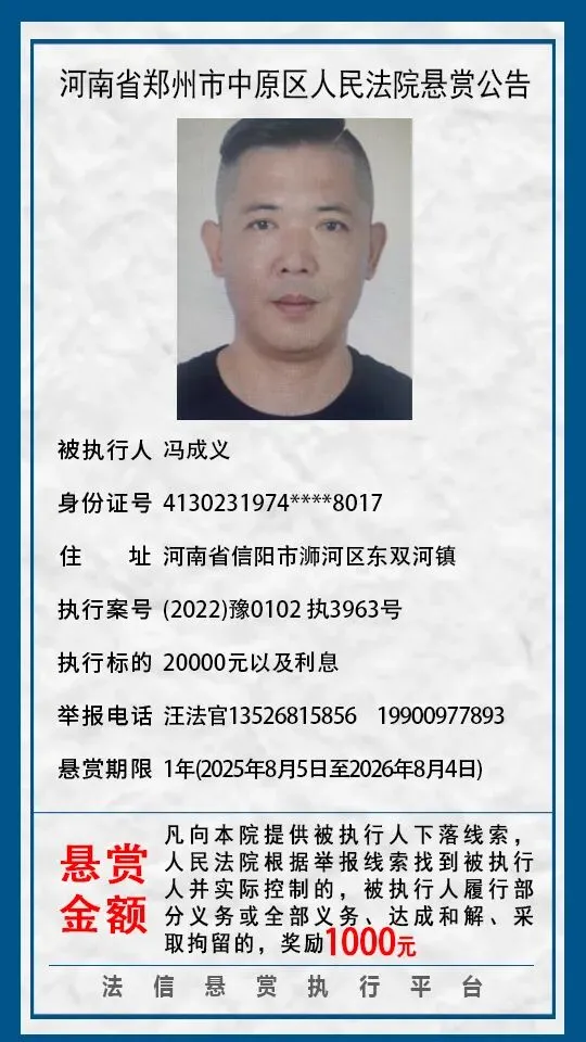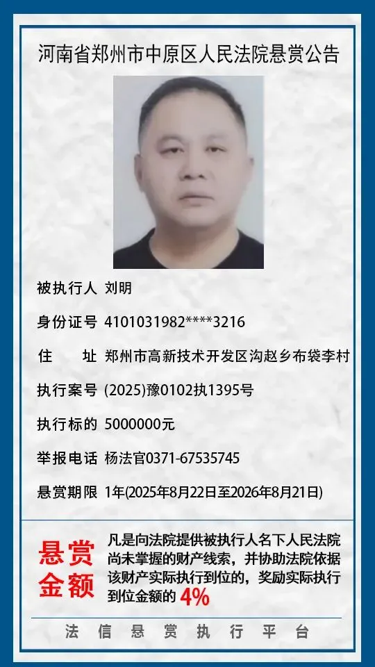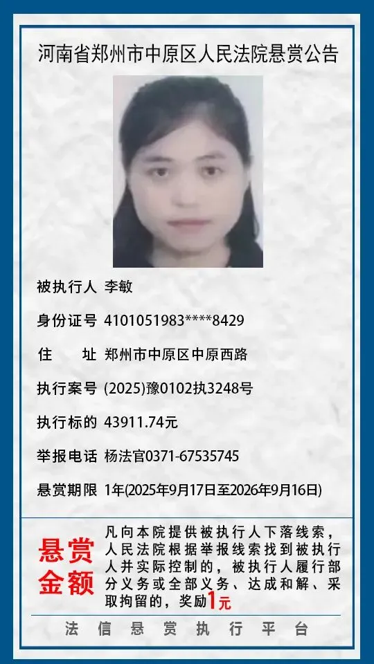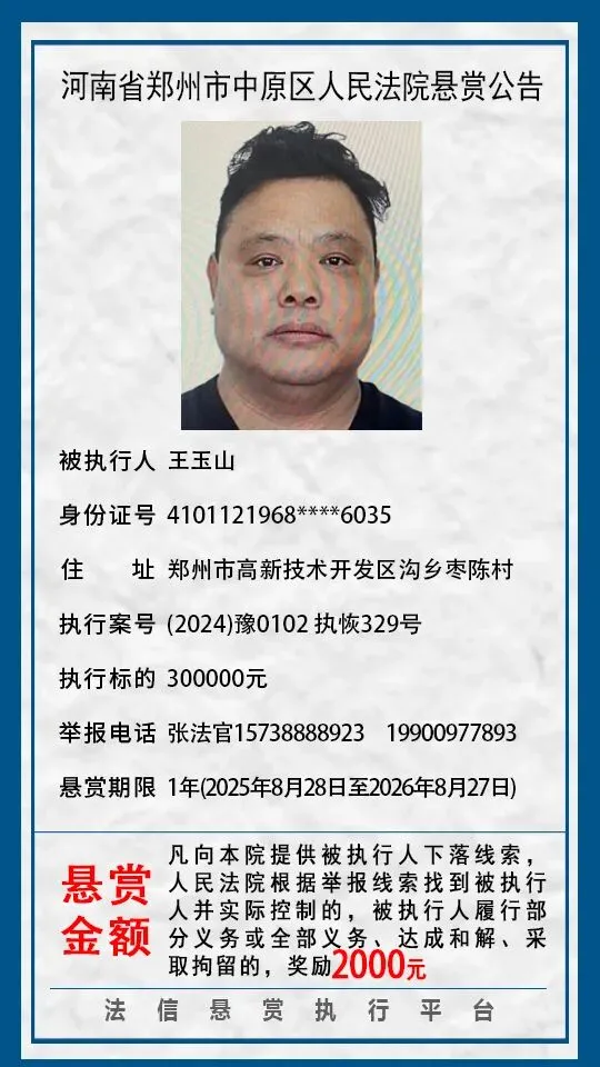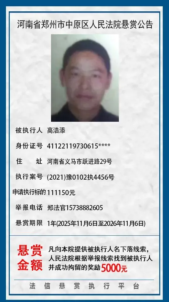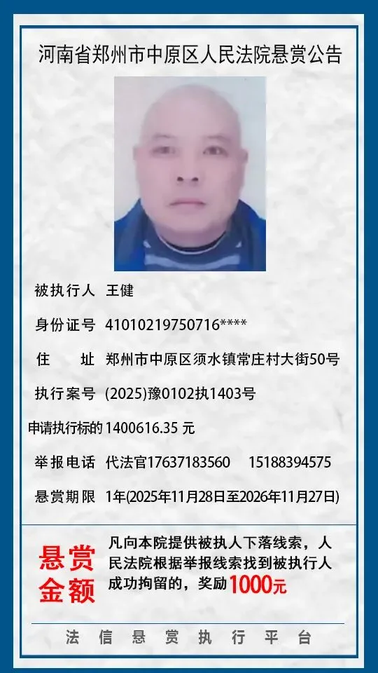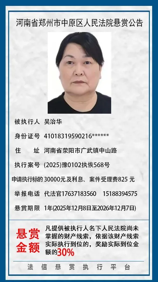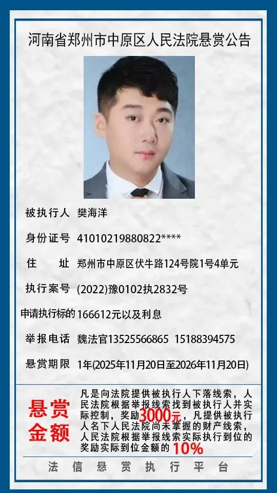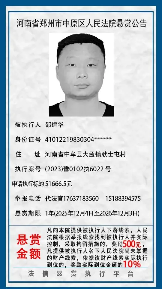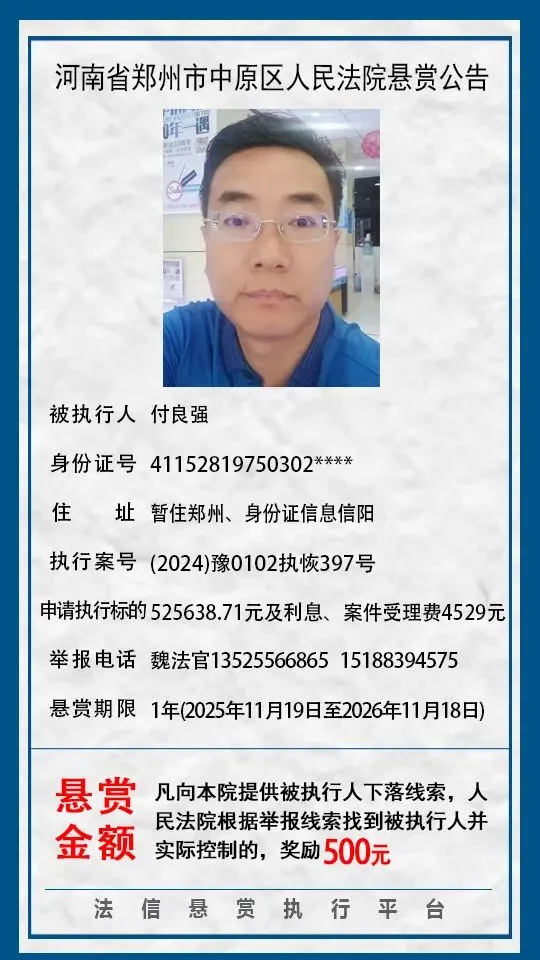 河南省郑州市中原区人民法院悬赏公告(2025年2月-2026年1月汇总)