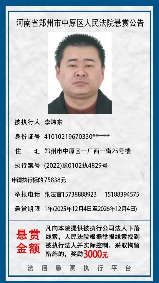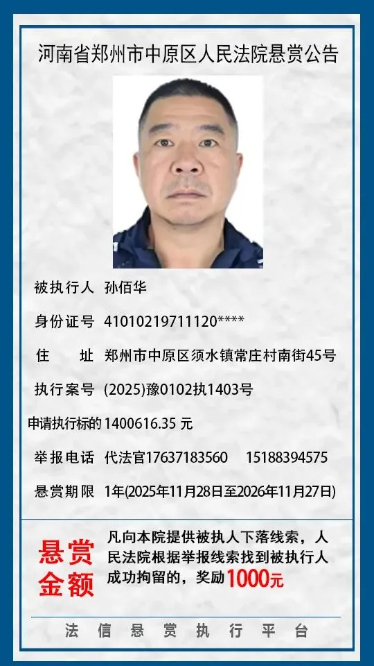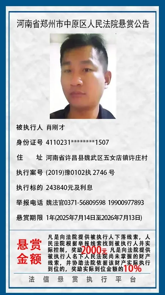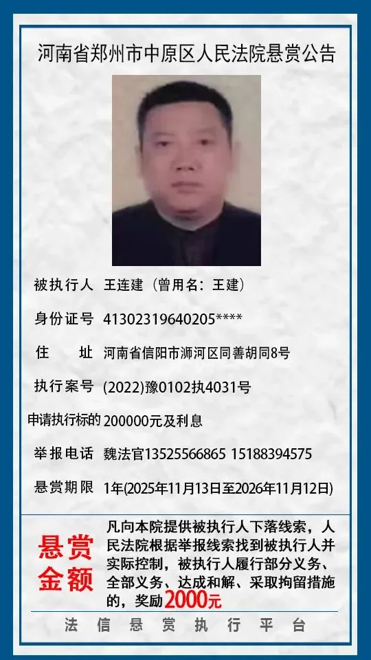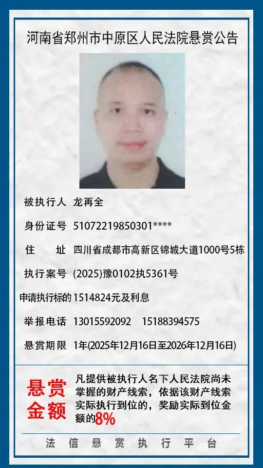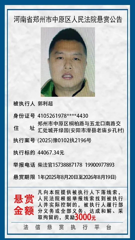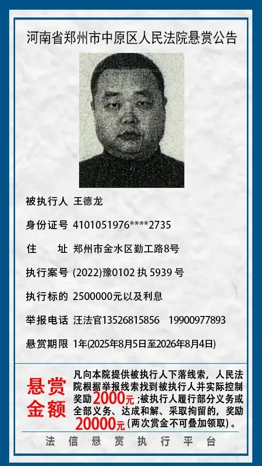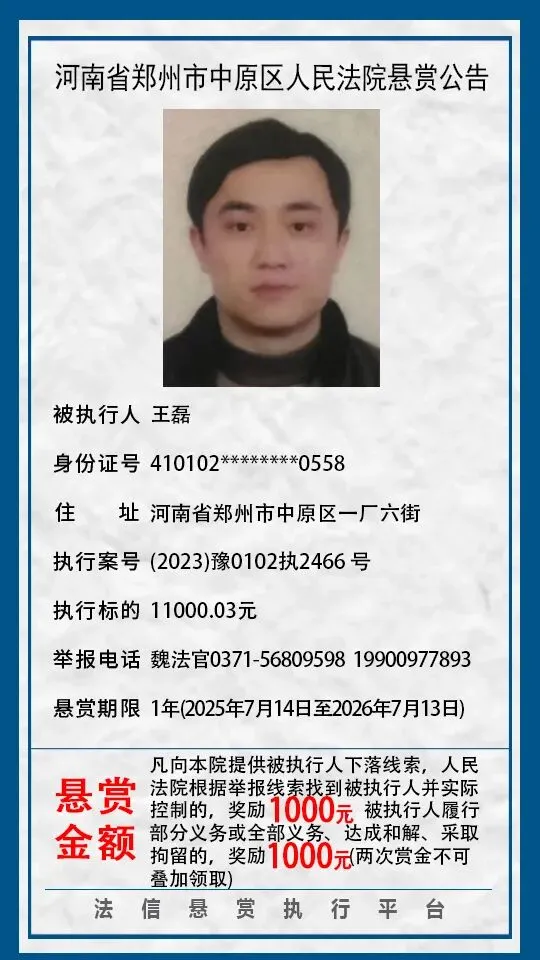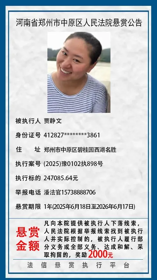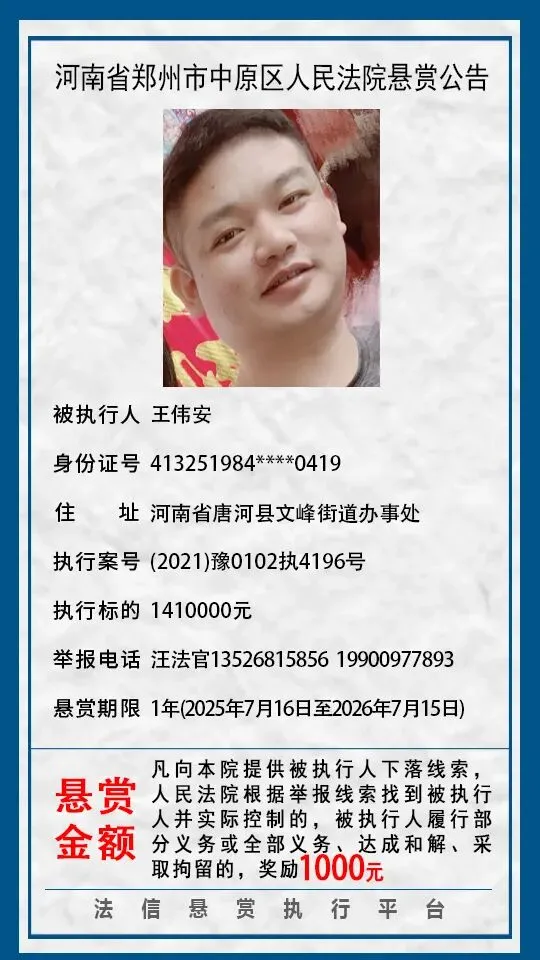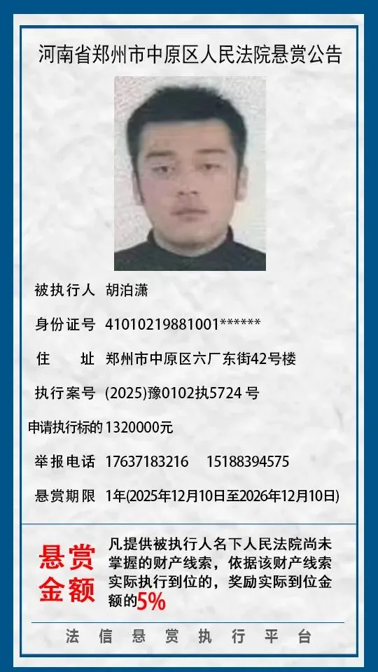 河南省郑州市中原区人民法院悬赏公告(2025年2月-2026年1月汇总)