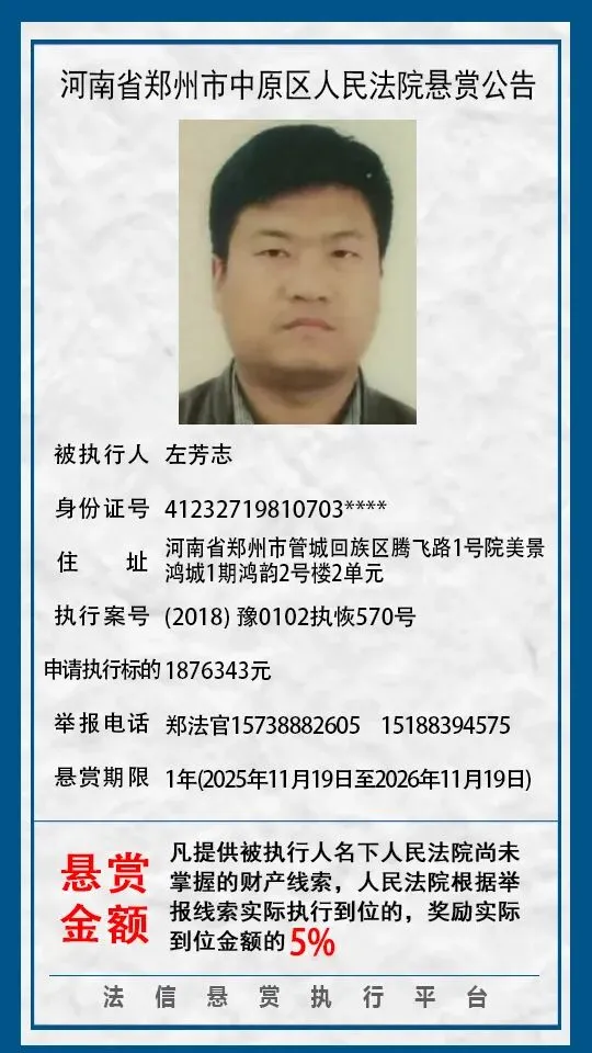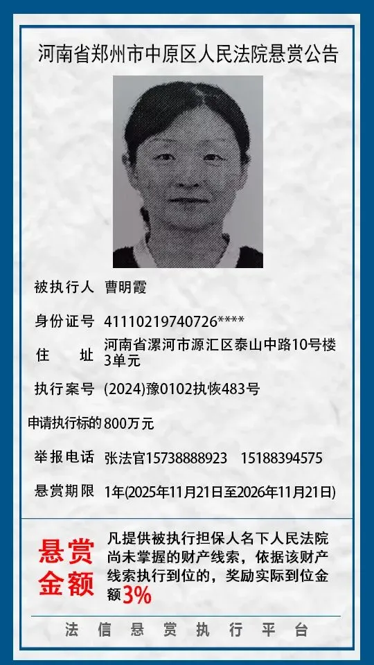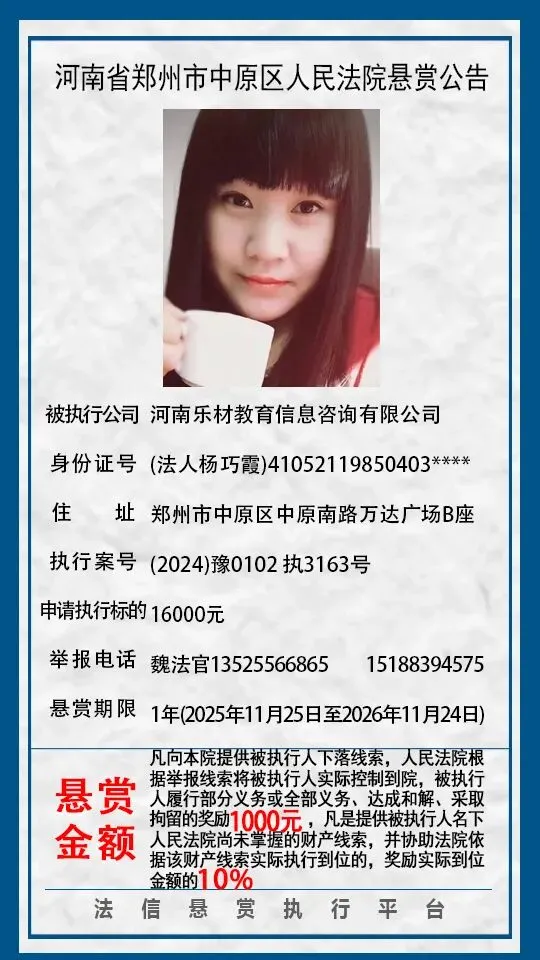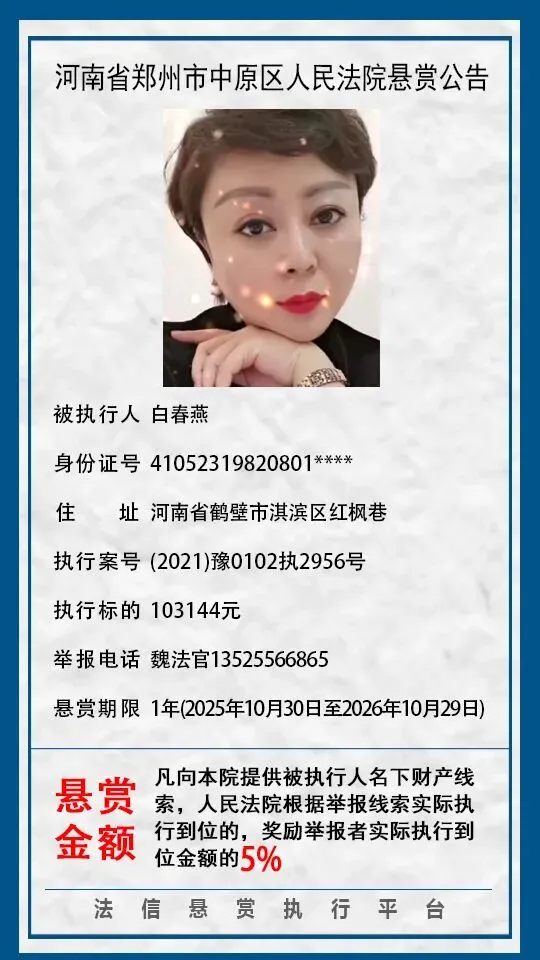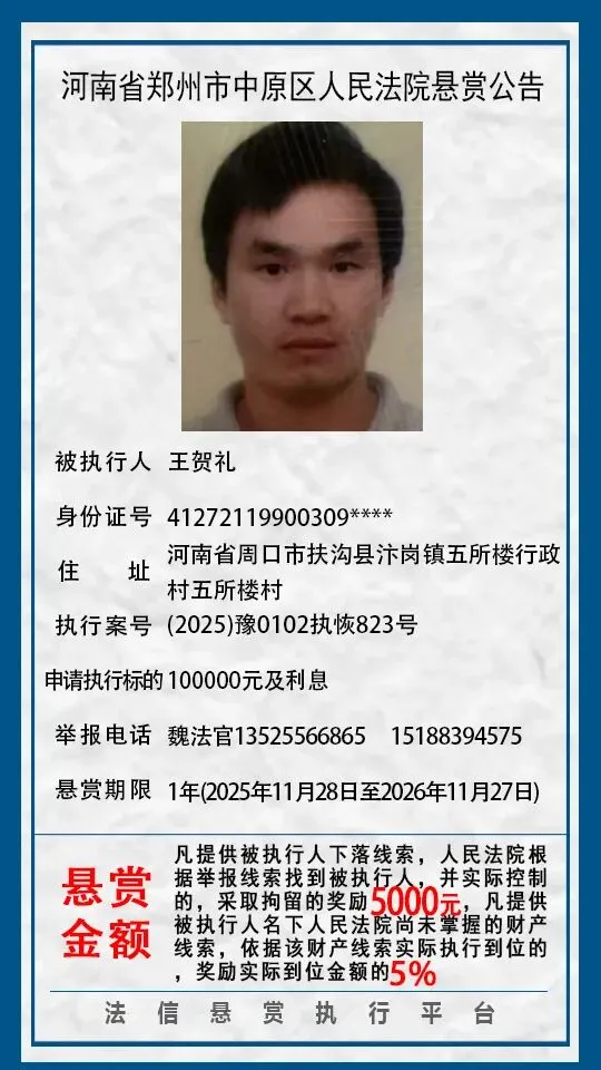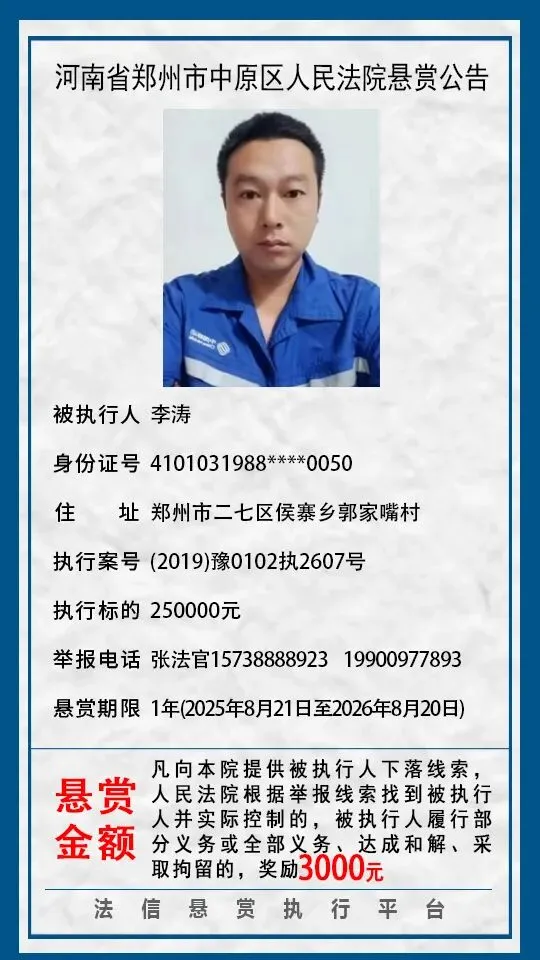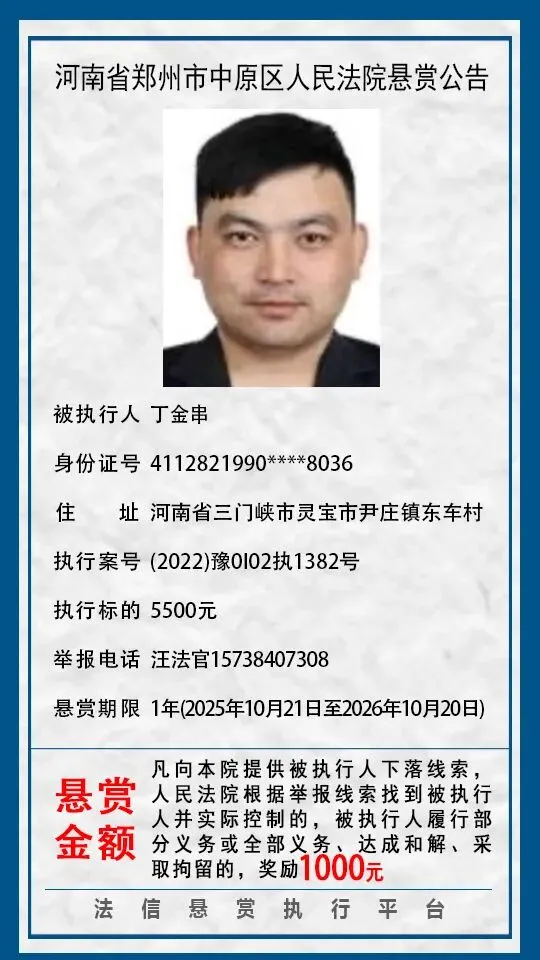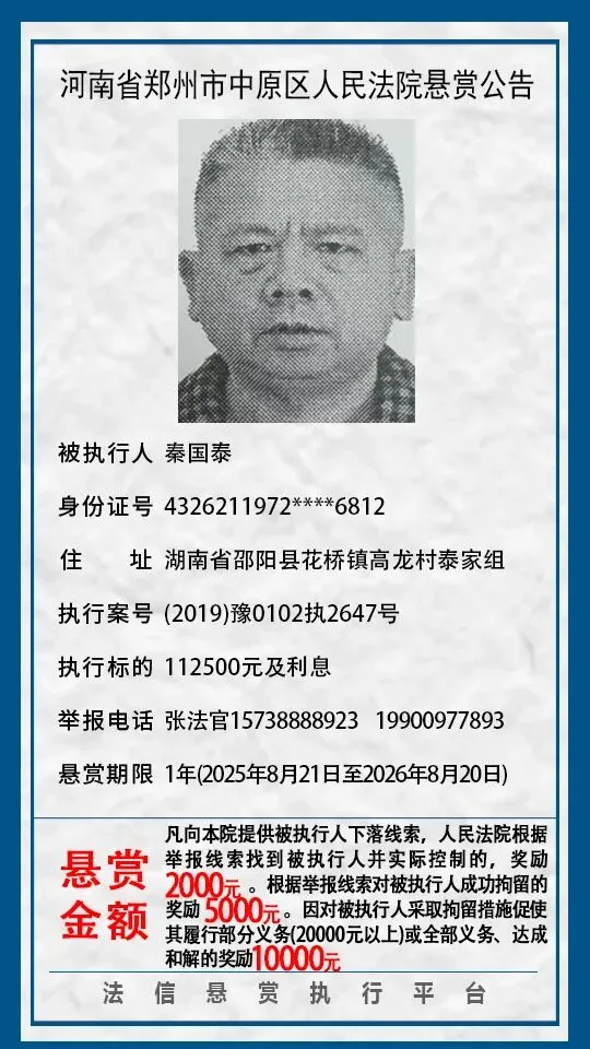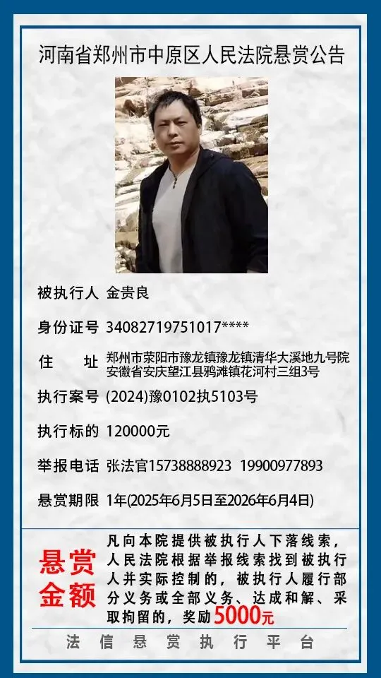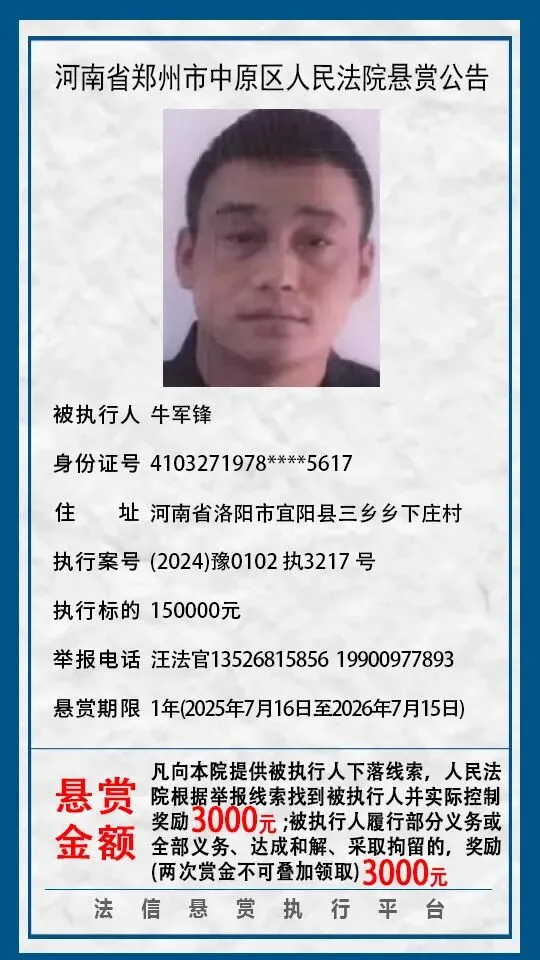 河南省郑州市中原区人民法院悬赏公告(2025年2月-2026年1月汇总)