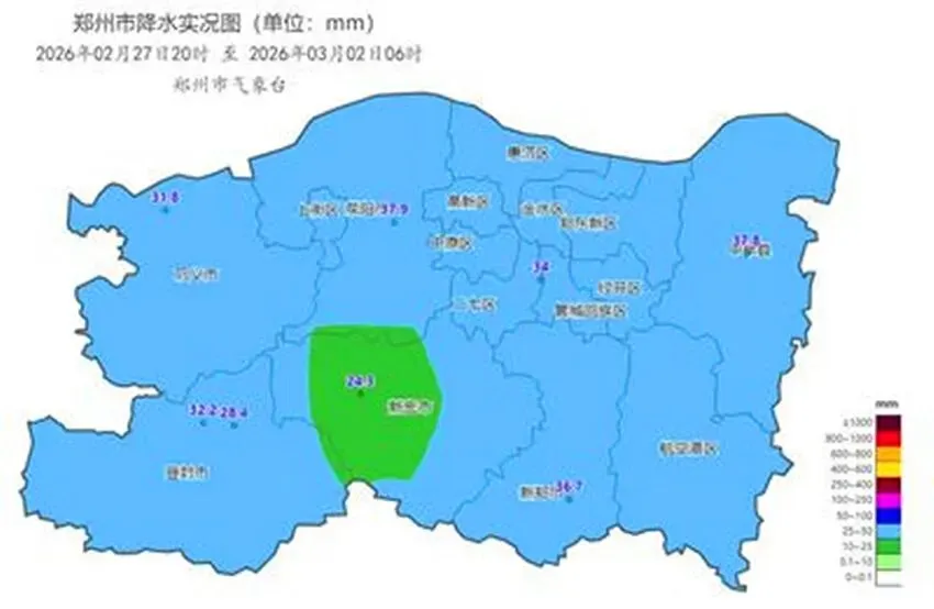 2月27日20点至3月2日6点,郑州市出现雨、冰粒、雨夹雪、雪等多种相态降水,郑州市区降水量达34毫米。市区各主次干道、城市快速路及各县(市)交通通行正常,水、气、暖供应平稳。