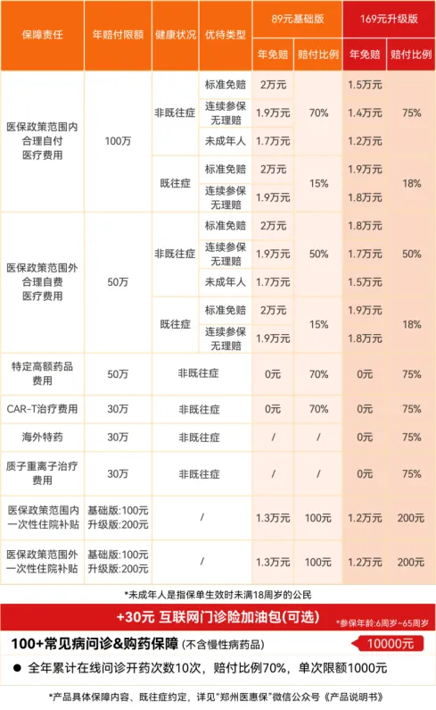 2026年度“郑州医惠保”产品依旧提供基础版与升级版,在原有基础之上,保障全面优化,门槛再降,新增补贴,市民可按需选择。