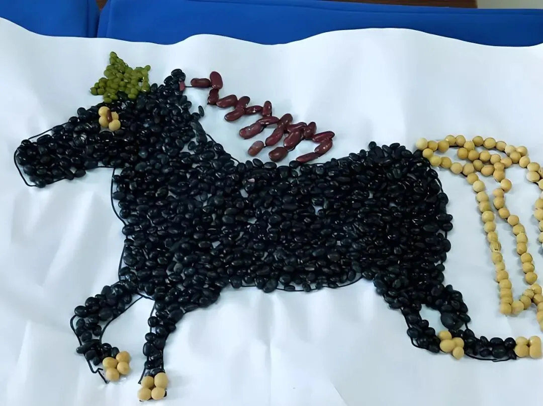 《辛·驰》《你我皆黑马》:在坚果分类的作品中,学生们并没有拘于形式,而是发挥创意。用手中的材料为素材,用马形图案装饰分类图谱,以“辛驰”致敬辛勤耕耘,以“黑马”寄寓逆袭成长;
