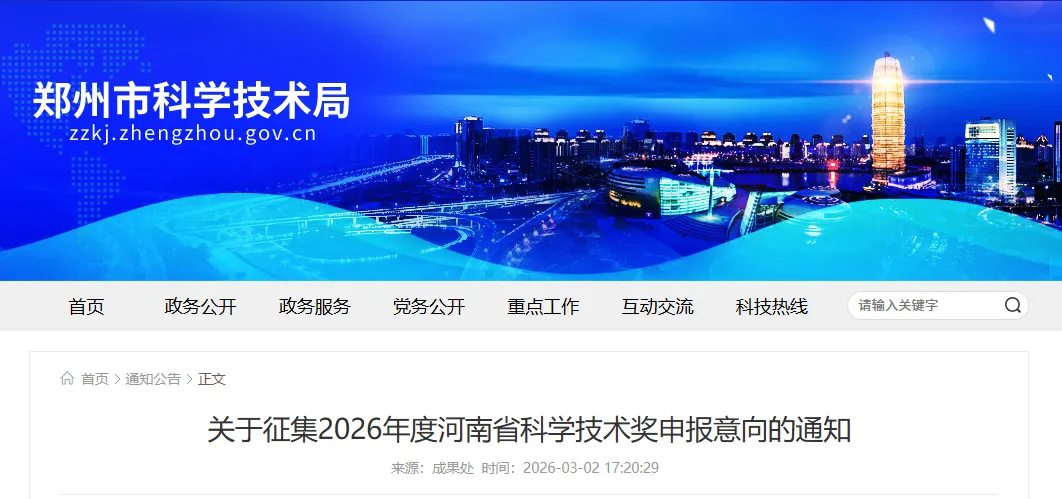 河南省科技厅预计于3月底正式启动2026年全省科学技术奖提名工作,郑州市计划4月中旬前完成受理及推荐上报工作,现拟提前谋划开展意向征集工作,有关事宜通知如下: