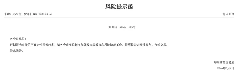 郑州商品交易所发布风险提示函:近期影响市场的不确定性因素较多,请各会员单位切实加强投资者教育和风险防范工作,提醒投资者理性参与、合规交易。