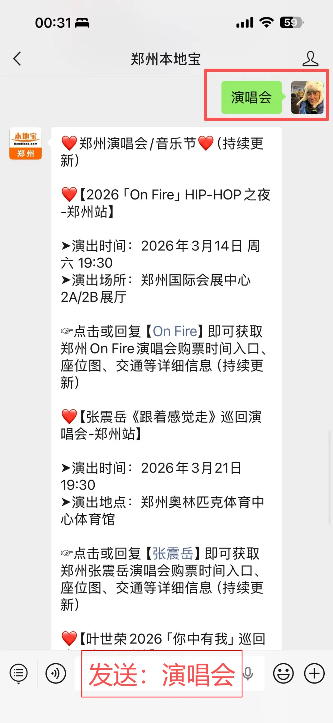 在对话框回复【演唱会】或明星歌手的名字