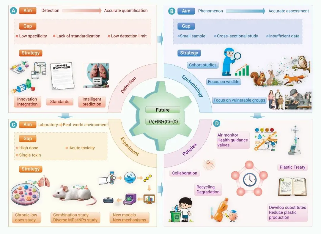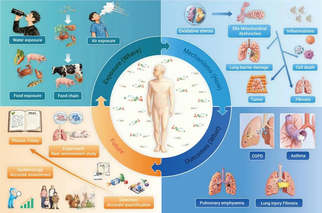 未来研究需系统性推进,开发高分辨、标准化的检测技术;开展大规模前瞻性研究,对敏感人群及野生动物进行长期追踪观察;在实验中采用环境剂量相当的真实塑料颗粒,并借助多组学、类器官等新模型阐明毒性机制。最终推动基于科学证据的公共卫生政策及塑料条约制定,从源头减少塑料污染与呼吸暴露风险。