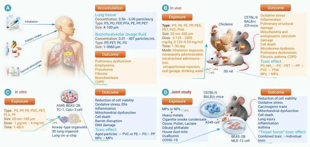 微塑料已在人体及动物呼吸系统中广泛检出,并证实可对呼吸道造成多重危害。流行病学研究表明微塑料可累积于肺组织与肺泡液,其与肺炎、肺功能下降等疾病风险上升相关。动物及细胞实验进一步揭示微纳米塑料主要经内吞作用被肺细胞摄取。微纳米塑料的呼吸毒性主要通过“氧化应激-炎症反应”启动,并进一步诱发多种细胞死亡途径(包括凋亡、焦亡、铁死亡和自噬)、DNA损伤、肺屏障功能破坏及纤维化,最终驱动哮喘、慢性阻塞性肺疾病等慢性呼吸道疾病的发生与发展。