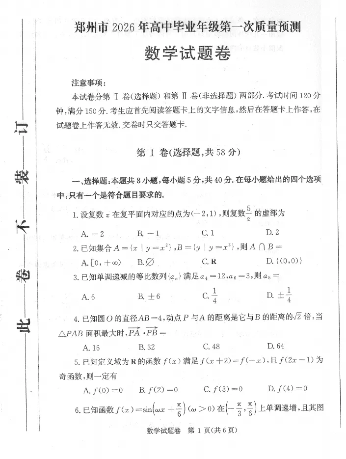 河南省郑州市2026届高三上学期第一次质量预测数学试卷+解析