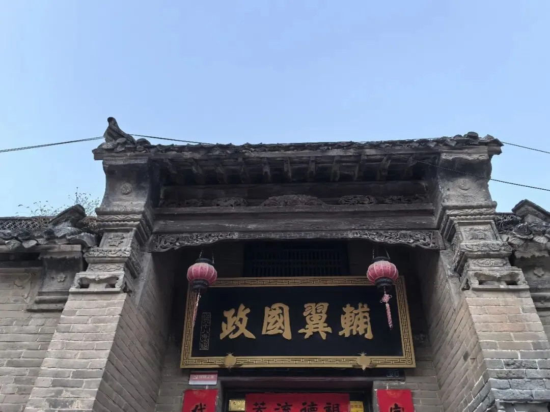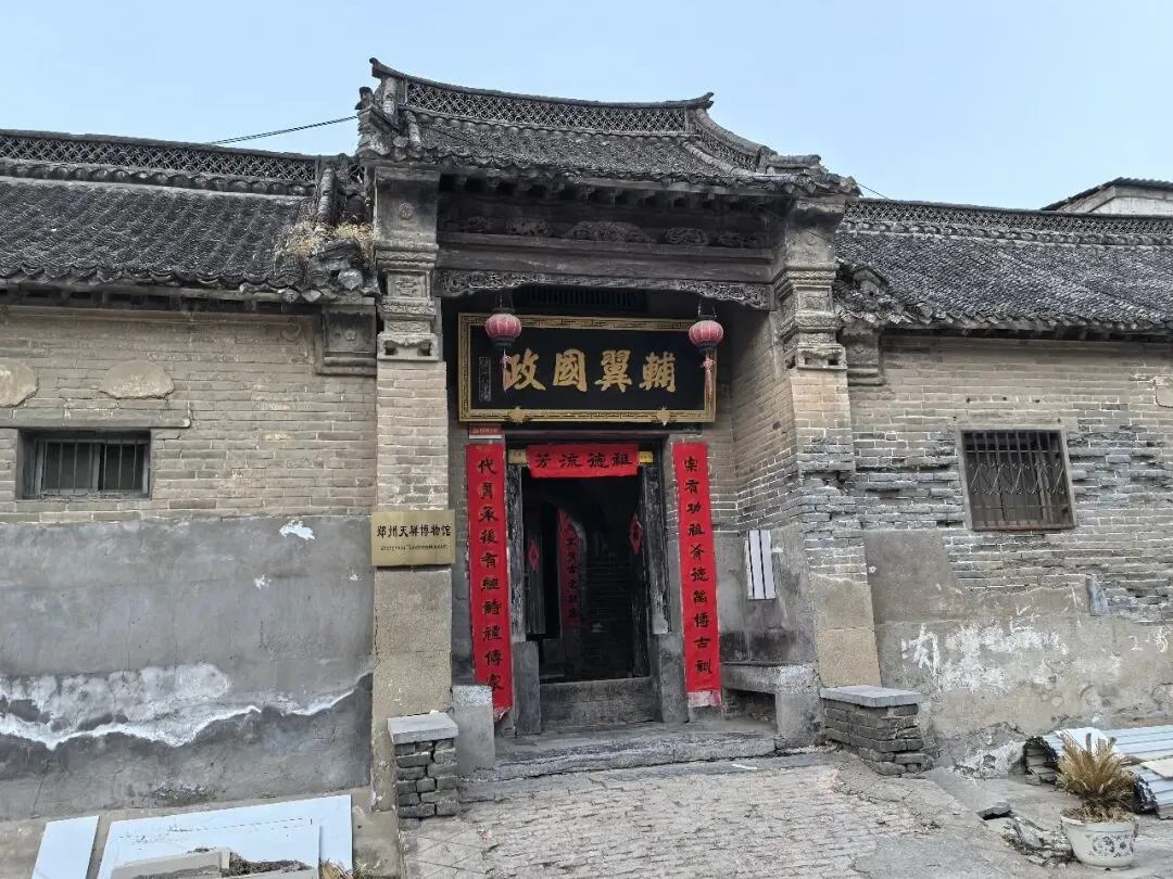 古宅的入户门不大,开在了整个宅院的东南角,实属罕见。大门门楣悬挂“辅翼国政”匾额,为道光十八年(1838年)御赐(现存为复制品)。正文楷体书写,端庄雄浑,典型的清代馆阁体,边框回文装饰,金色勾边。彰显任家先祖在朝为官的荣耀。门槛高厚,门板为百年老榆木,黑漆斑驳,犹存威严。门前上马石两方,默然对峙。地面铺青石板,早被岁月磨得不平,却在凹陷处泛起一层温润的幽光——那是两百多年间,任氏族人、访客仆役和今之游客,一一踏过的痕迹。两侧山墙突出的墀头砖雕,顶部圆形开光、中部瑞兽、下部花卉,右左分别雕刻有“福”字和“壽”字。左墀头砖雕上,挂有“郑州天祥博物馆”的牌匾。