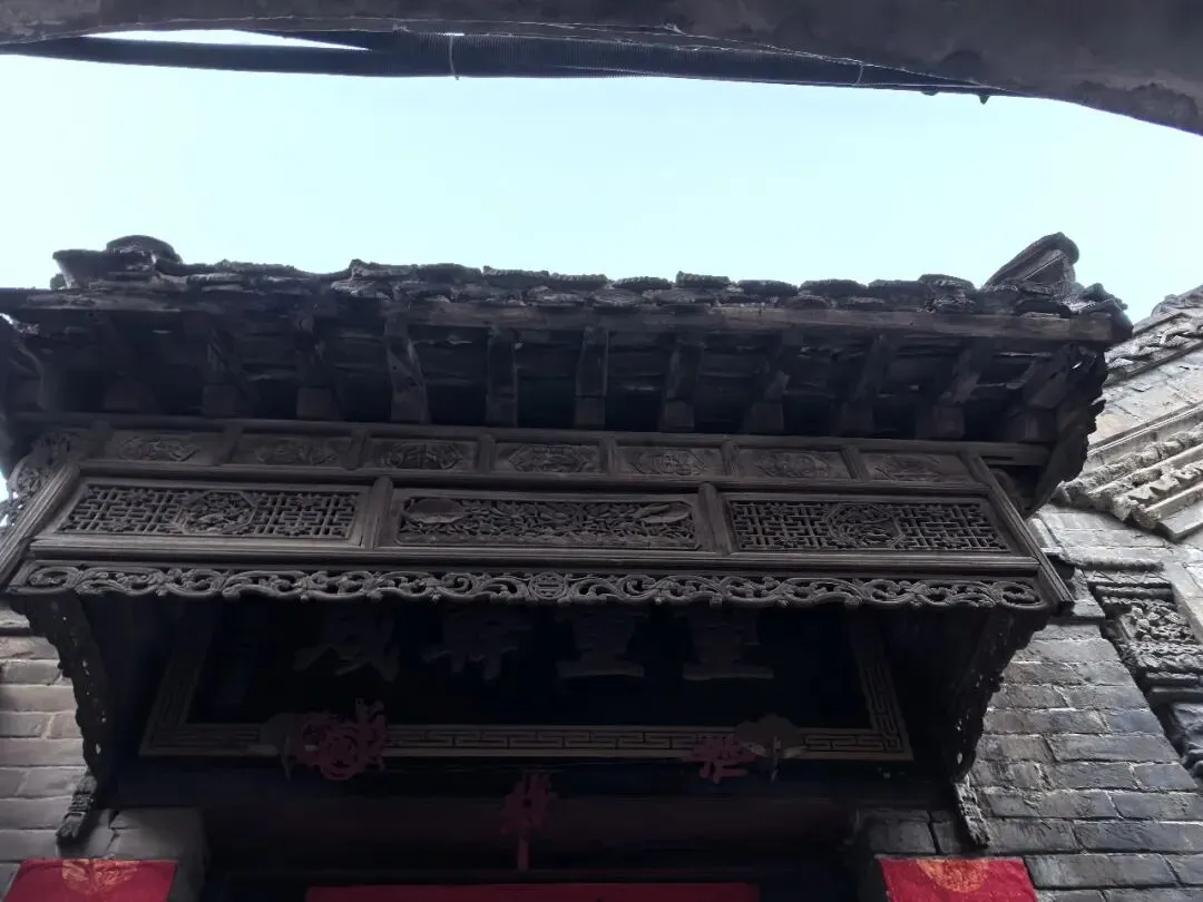 正厅的檐廊木雕与隔扇窗,展现了清代道光年间中原官宅“三雕”艺术的巅峰水准。额枋通雕采用四层镂空透雕技法,主题为“福禄寿喜”——左侧梅花鹿衔灵芝,中部蝙蝠衔寿桃,右侧喜鹊登梅,间隙缠枝牡丹朵朵不重样。雀替为龙形圆雕,龙身卷曲,鳞须纤毫毕现,虽任家为二品官宅降格使用,仍显皇家气象。隔扇窗棂为“龟背锦”与“步步锦”相间,日光穿透时在地上投下细碎花影。