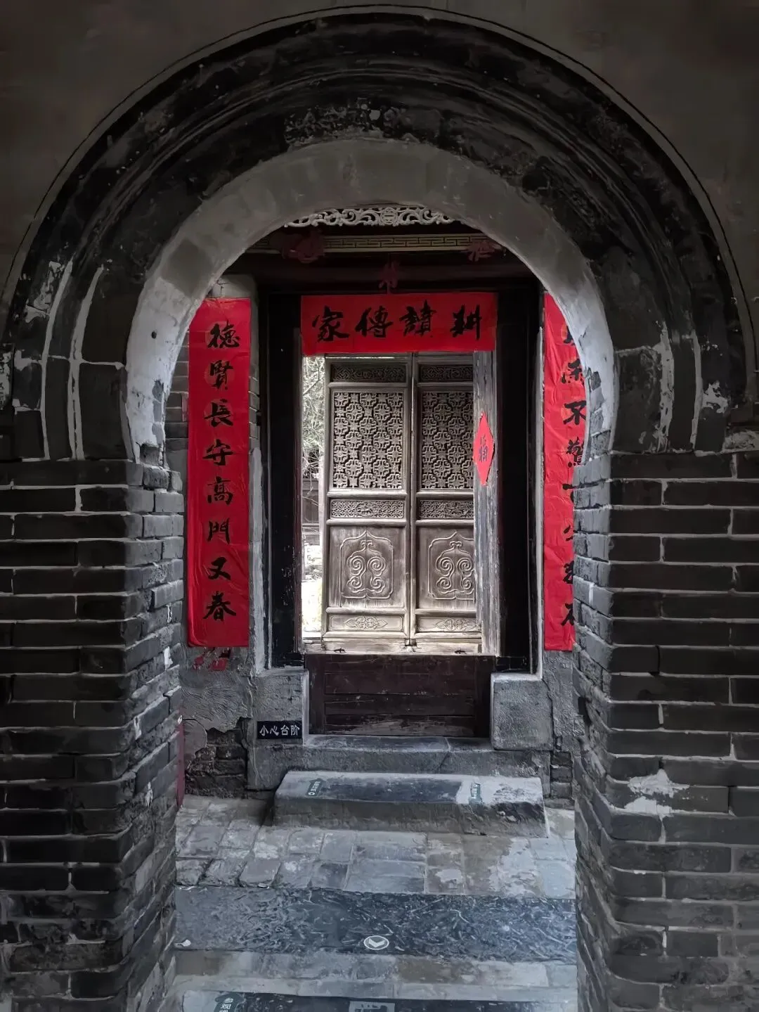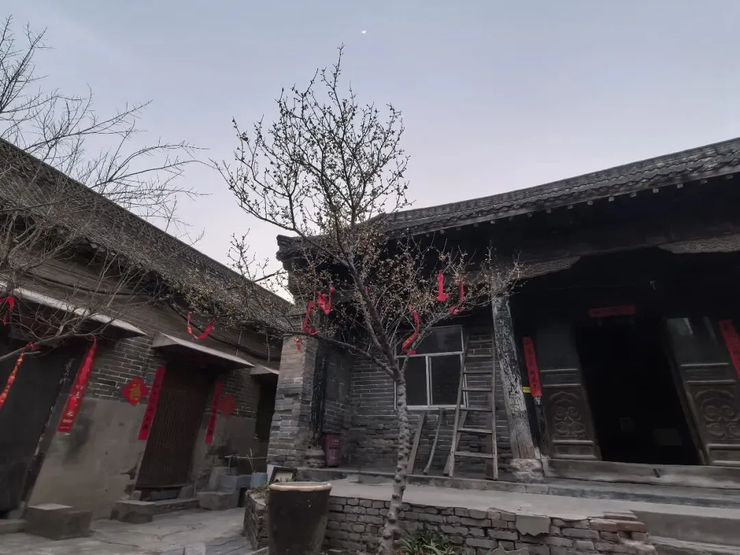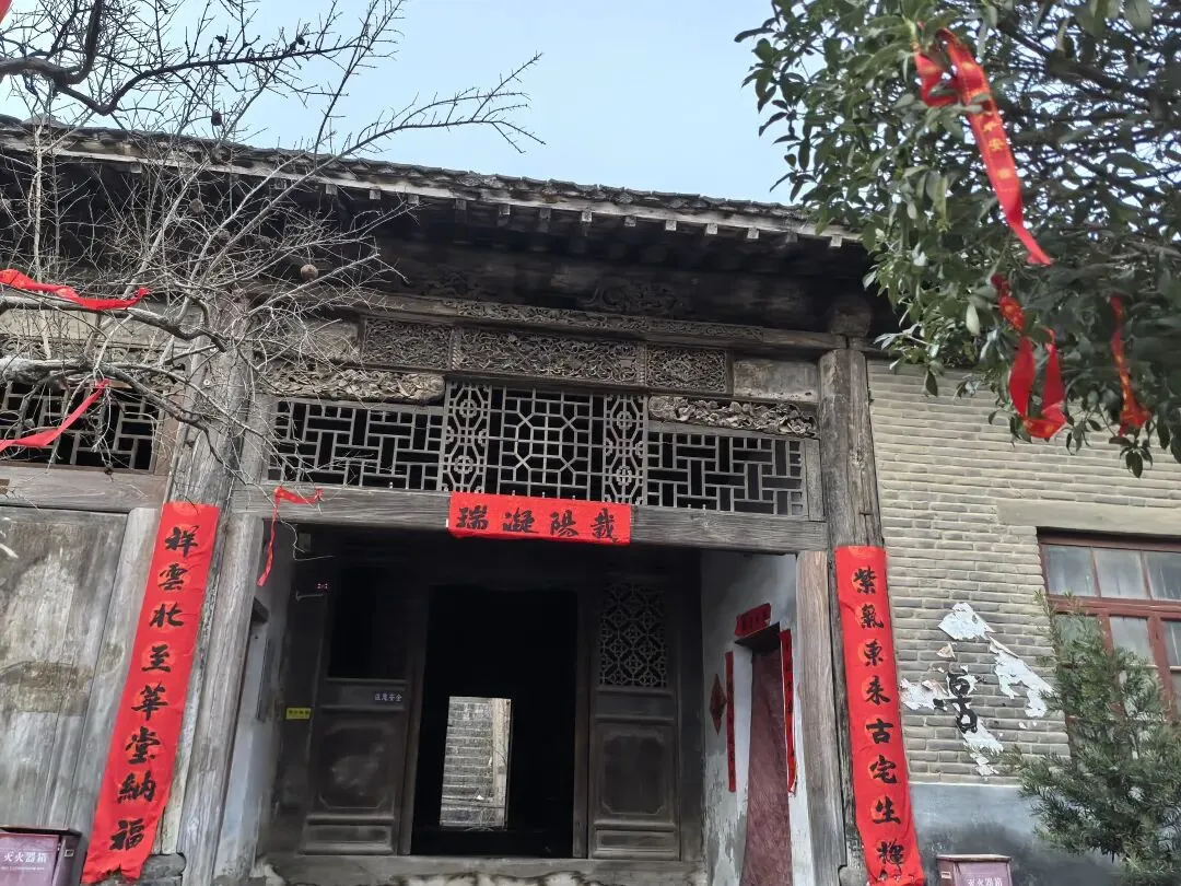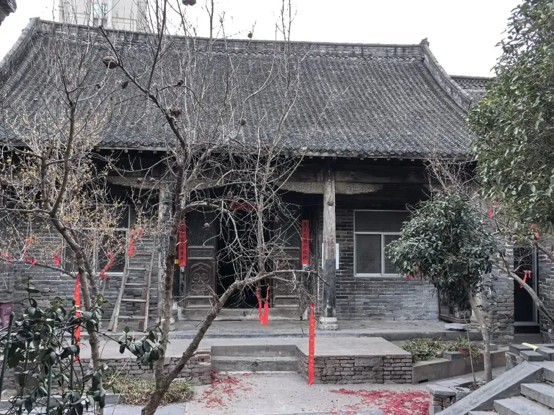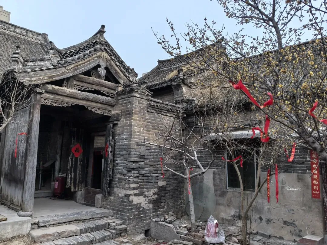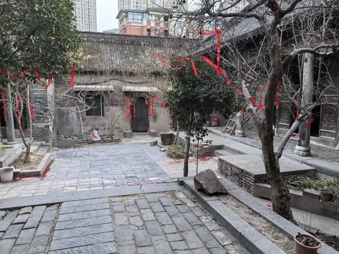 绕过垂花门,才算进入前院。院子不大,很干净,一株腊梅正独自绽放,鹅黄色的花朵缀满疏枝,如星子落满枝头,暗香浮动,清冽幽远——那是独属于冬日的凛冽芬芳,不张扬,却穿透了青砖灰瓦的沉寂,为这座古宅添了一缕鲜活的生气。院中另有石榴、桂花树数株,红丝带满系枝头,随风轻扬。任家大院二门内原有石榴树一株,据传为清道光年间任德润手植,取“多子多福”之意。2007年拆迁期间,枯树复生,被任家后人视为守业精神的象征。今树仍在,每年开花结果,成为访客合影之景。各个门上都还贴着春联,“祖德流芳”、“宗功永继”——年味浓得化不开,仿佛七代人的团圆,从未散场。