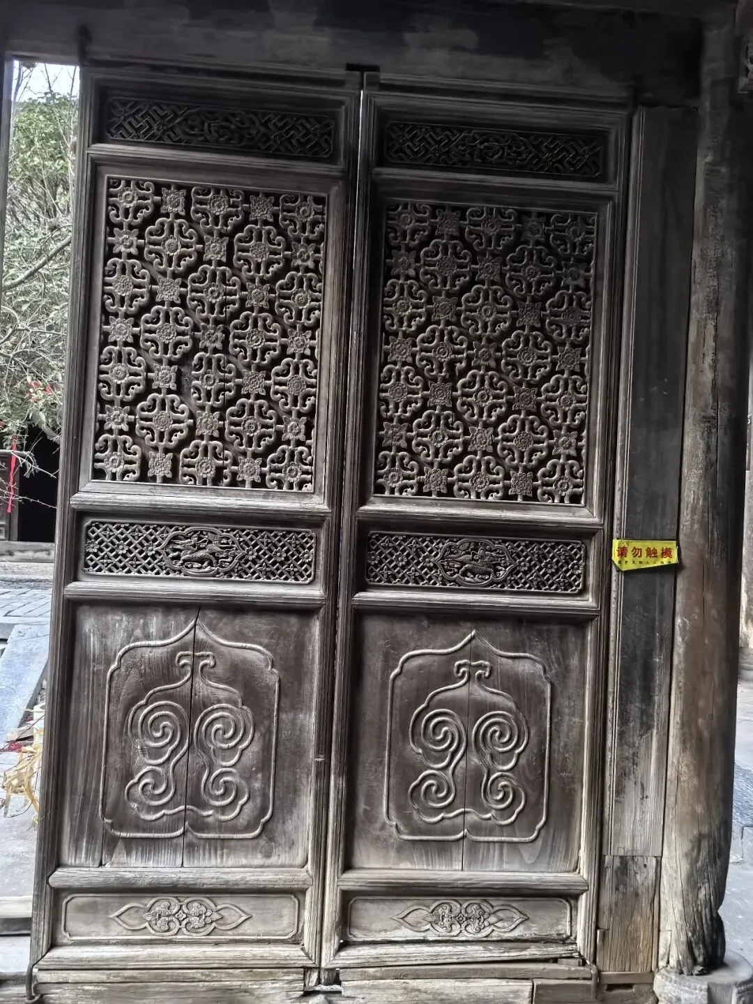 二道门内的屏风门是镇宅之宝。这扇隔扇门采用“五抹头”制式(横向五根抹头分隔),由上至下分为五个功能区:最上是浅浮雕回纹绦环板;作为屏风上半部主体,上二为镂空透雕云纹格心,布满几十朵花卉朵朵不重样;中部格心是多层镂空透雕的“日月麒麟”主题图案;下二为浅浮雕的暗八仙(葫芦、扇子等)绦环板;最下裙板是如意云纹,四朵如意头云纹对称排列,形成"四合如意"图案,寓意事事如意、四季平安。
