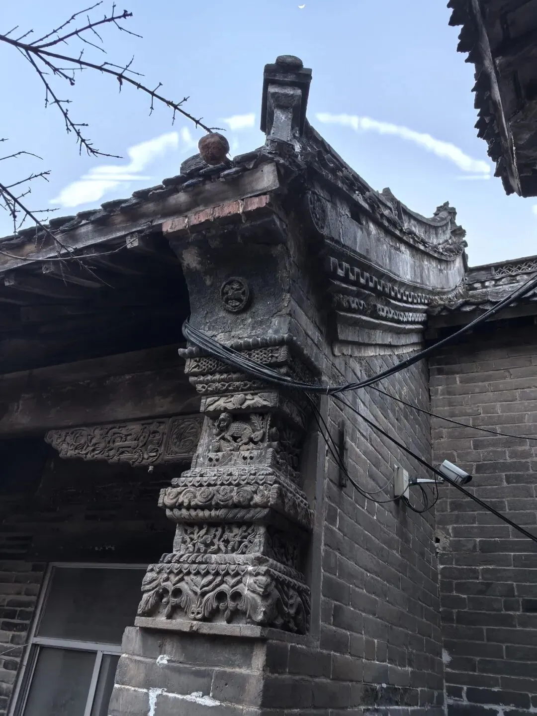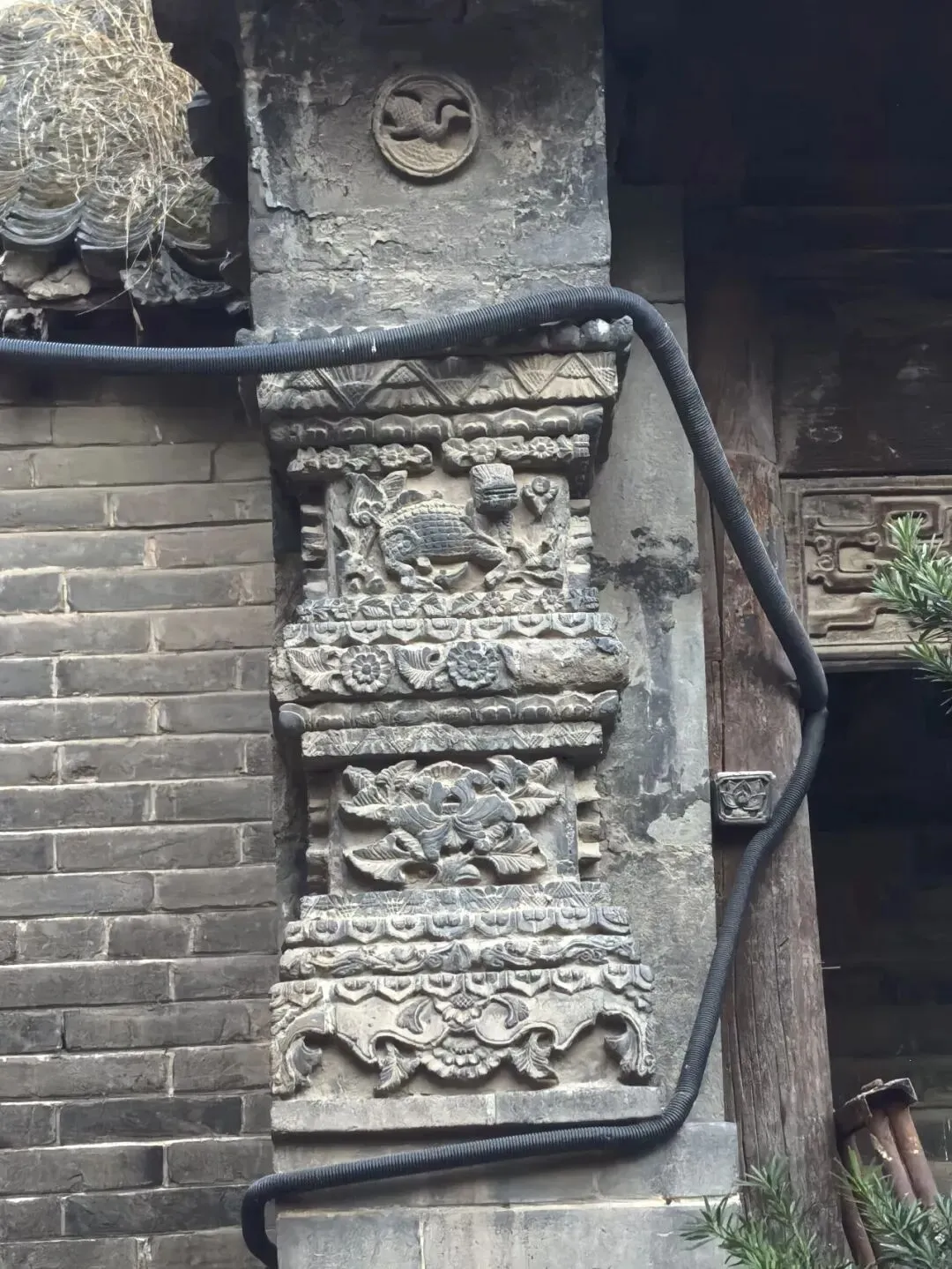 墀头砖雕庄重朴素而威严,顶部圆形开光内为太极图或云纹,象征阴阳调和;中部麒麟献瑞,脚踏祥云,口衔灵芝;下部牡丹盛开,花瓣层叠,叶脉清晰。砖雕与木构交接处,可见雀替与梁头的雕花,刀法深峻,虽漆色褪尽,仍见道光年间的匠心。