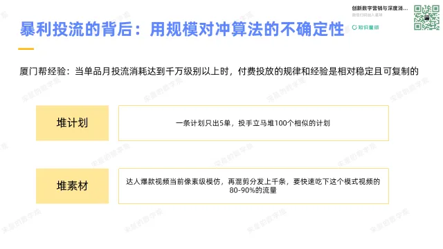 你看我前面讲的,会觉得郑州帮和厦门帮打法差异很大,但是实际上,它们的本质是一样的,就是堆基建。郑州帮,堆内容基建;厦门帮堆产品基建。只要能想出办法,通过更低的成本堆出更多的量,就能换来更多的流量,产生更多的转化。堆长尾的内容是如此,不断测试高毛利的新产品也是如此。