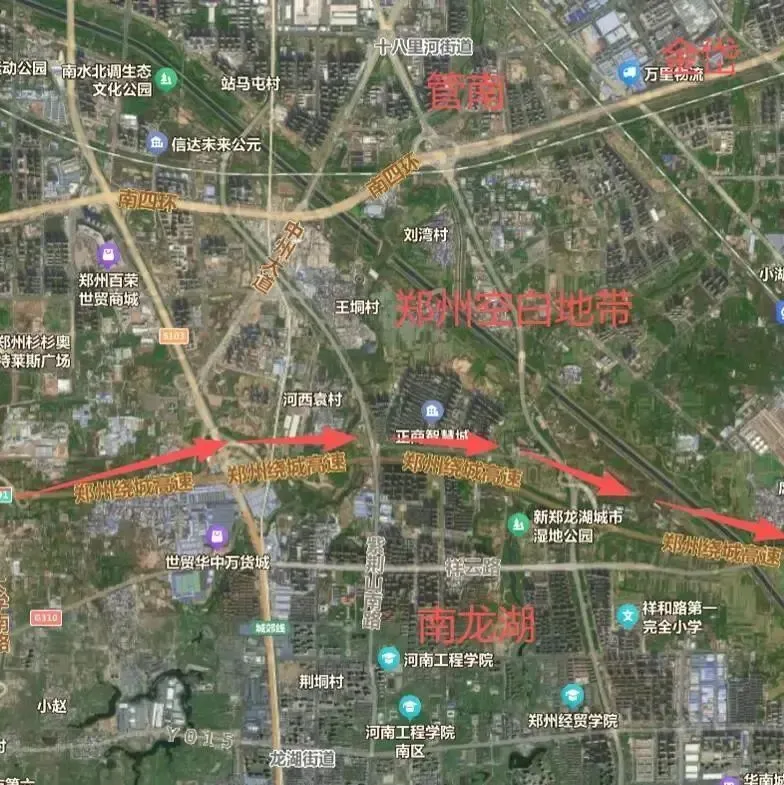 港区虽然规划上与郑州保持距离,但交通通行成本高。机场高速需三四十分钟,城郊线更耗时,资源难以共享。郑州人不愿去双鹤湖游玩,港区居民也少去郑州消费。南龙湖与郑州绕城近在咫尺,出入却像跨越两个平行世界。南龙湖商业繁荣、人口密集、大学城集聚,但路况糟糕。龙湖大道堵在祥云路段半小时的情况并不少见。洞林湖的交通逻辑也相同。