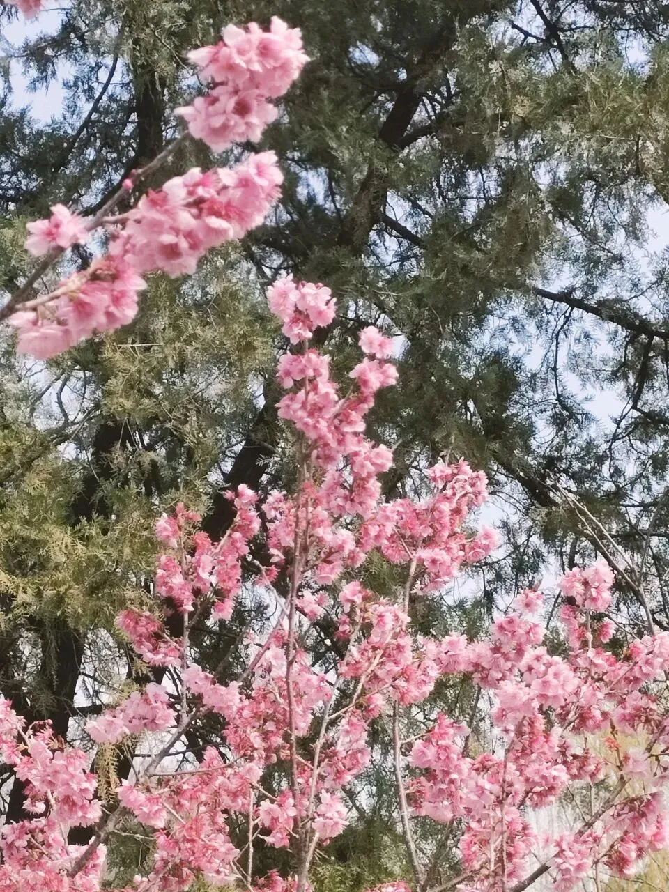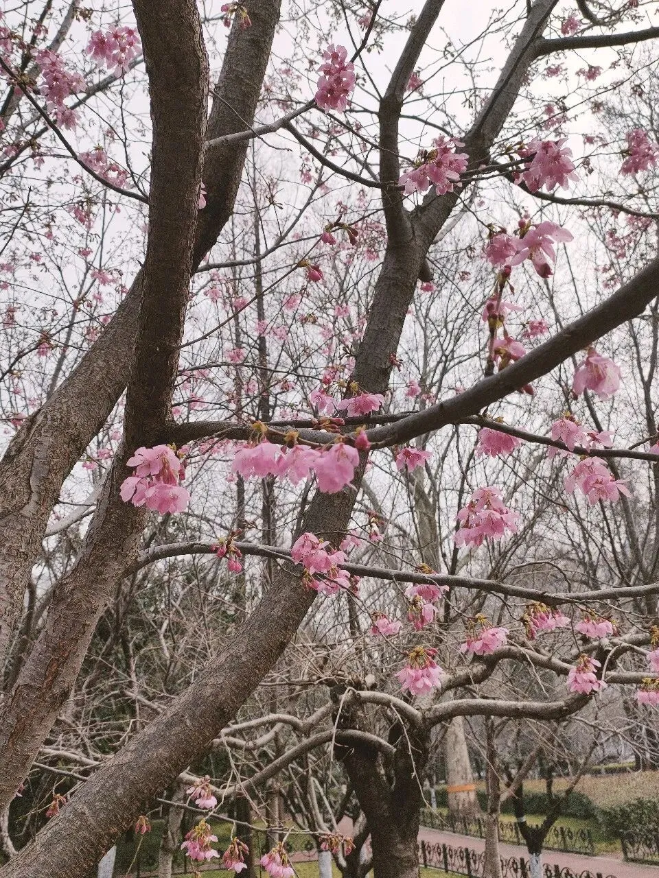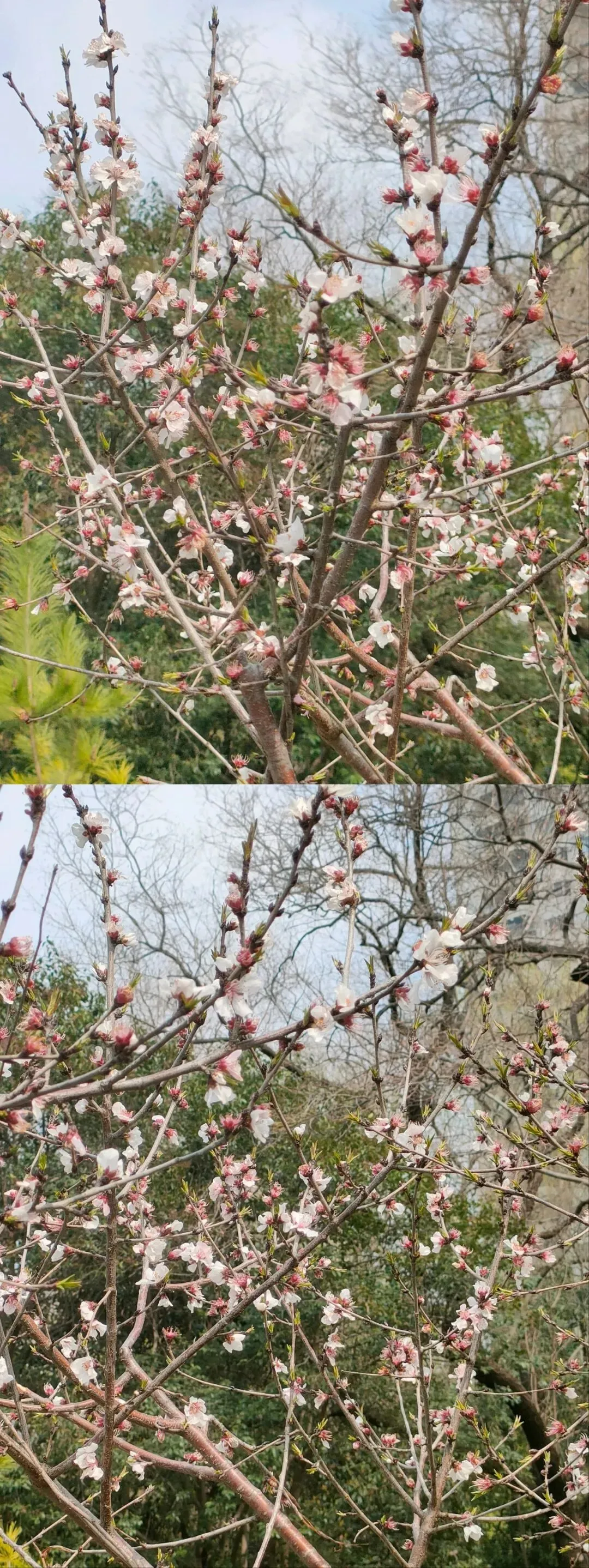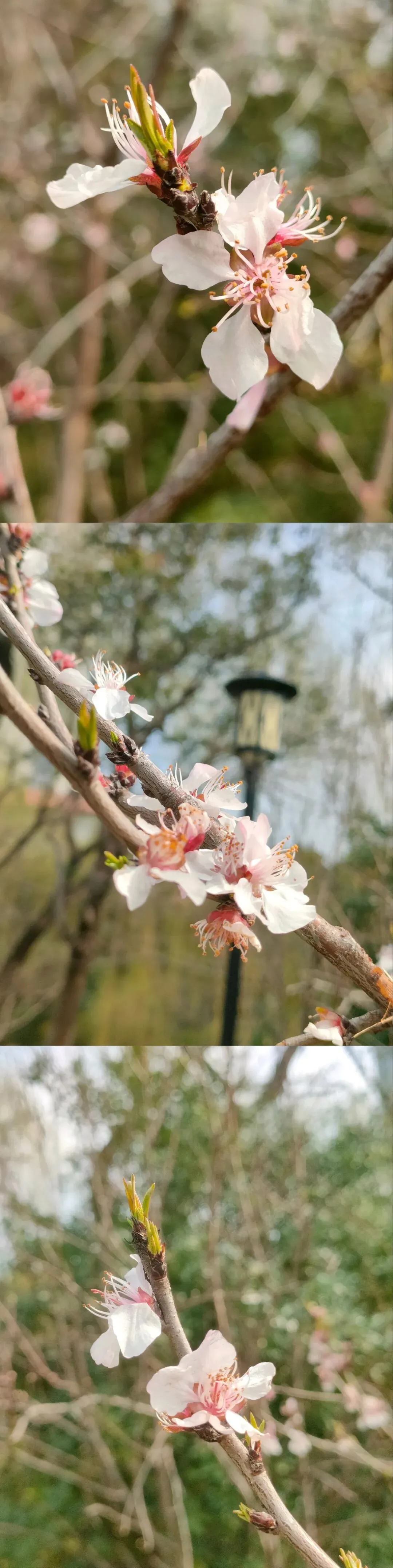 这个品种是此时公园里的明星,花朵为粉红色,花色艳丽、花型独特,花瓣边缘带有细密的流苏状结构,花团簇拥在枝条上,在蓝天映衬下格外鲜艳。先花后叶,成片绽放时红、粉、白相间,如烟似霞,轻盈柔媚,这才是春天的样子呀。