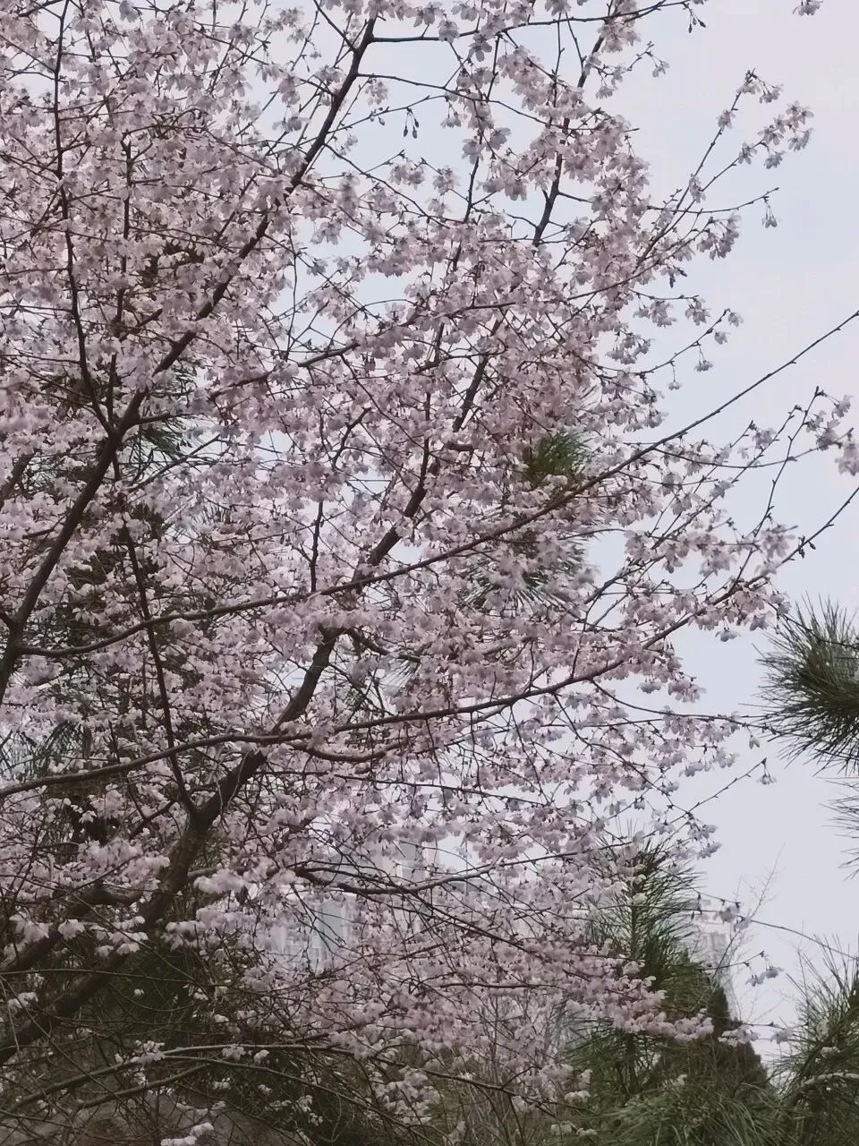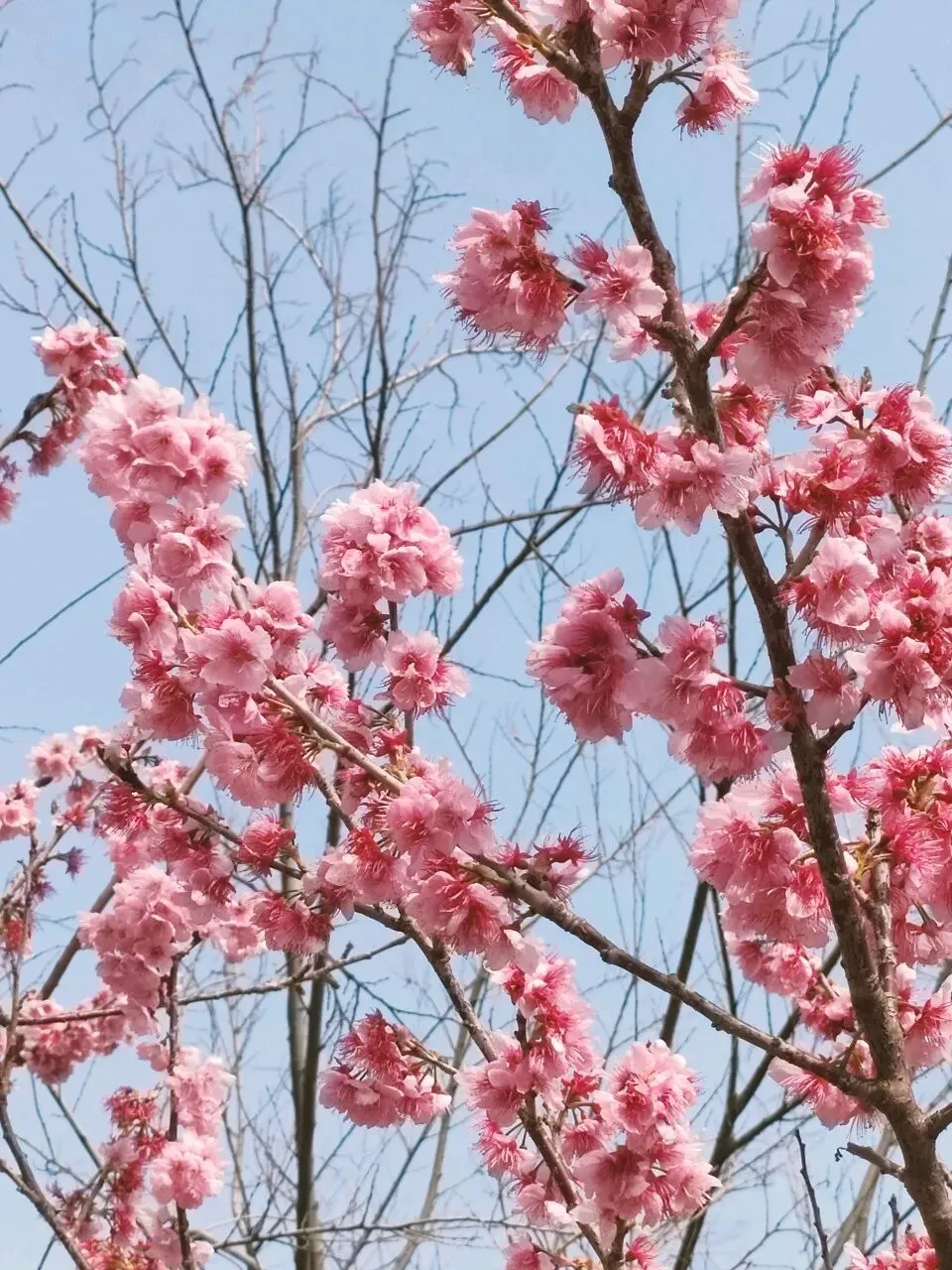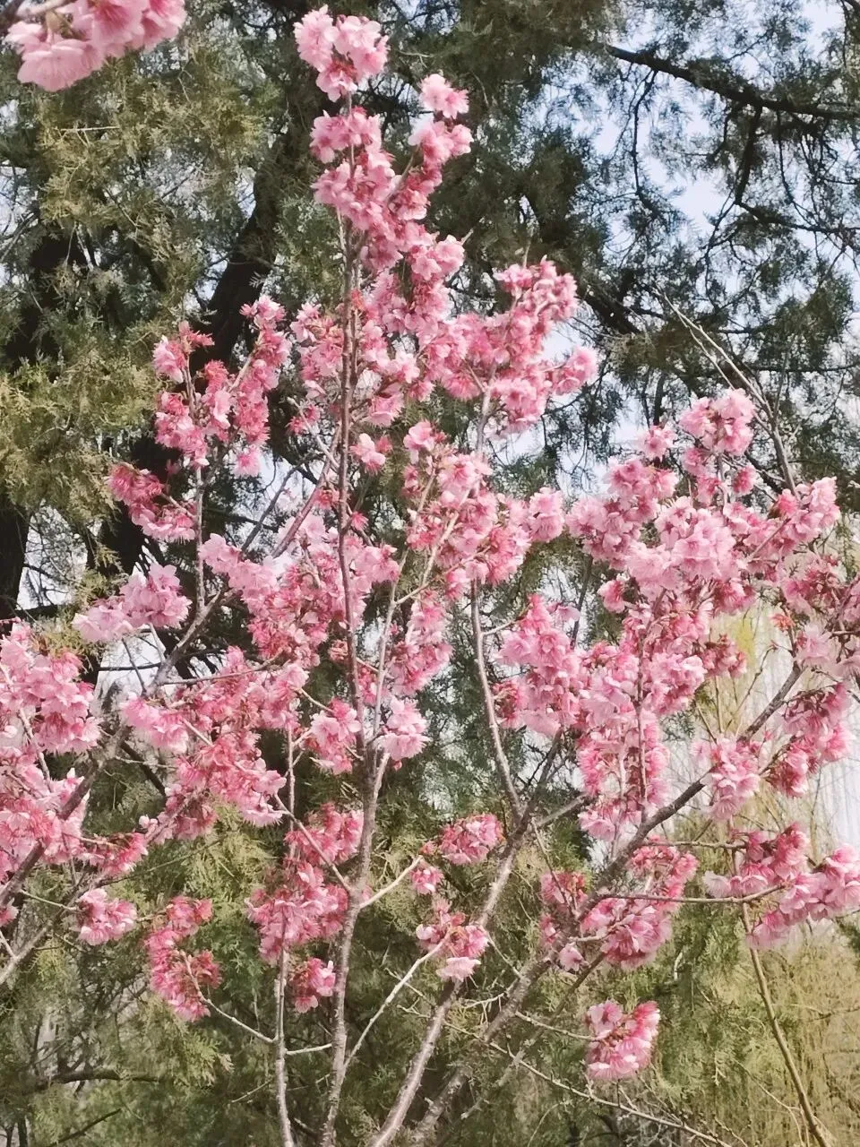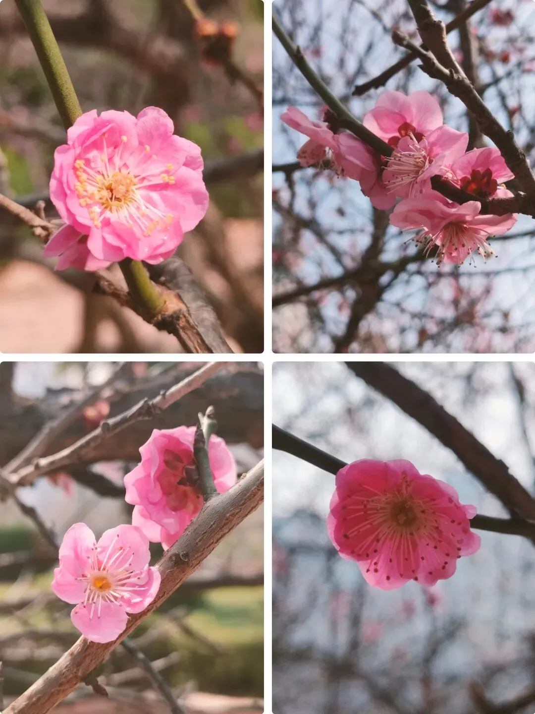 这个品种是此时公园里的明星,花朵为粉红色,花色艳丽、花型独特,花瓣边缘带有细密的流苏状结构,花团簇拥在枝条上,在蓝天映衬下格外鲜艳。先花后叶,成片绽放时红、粉、白相间,如烟似霞,轻盈柔媚,这才是春天的样子呀。