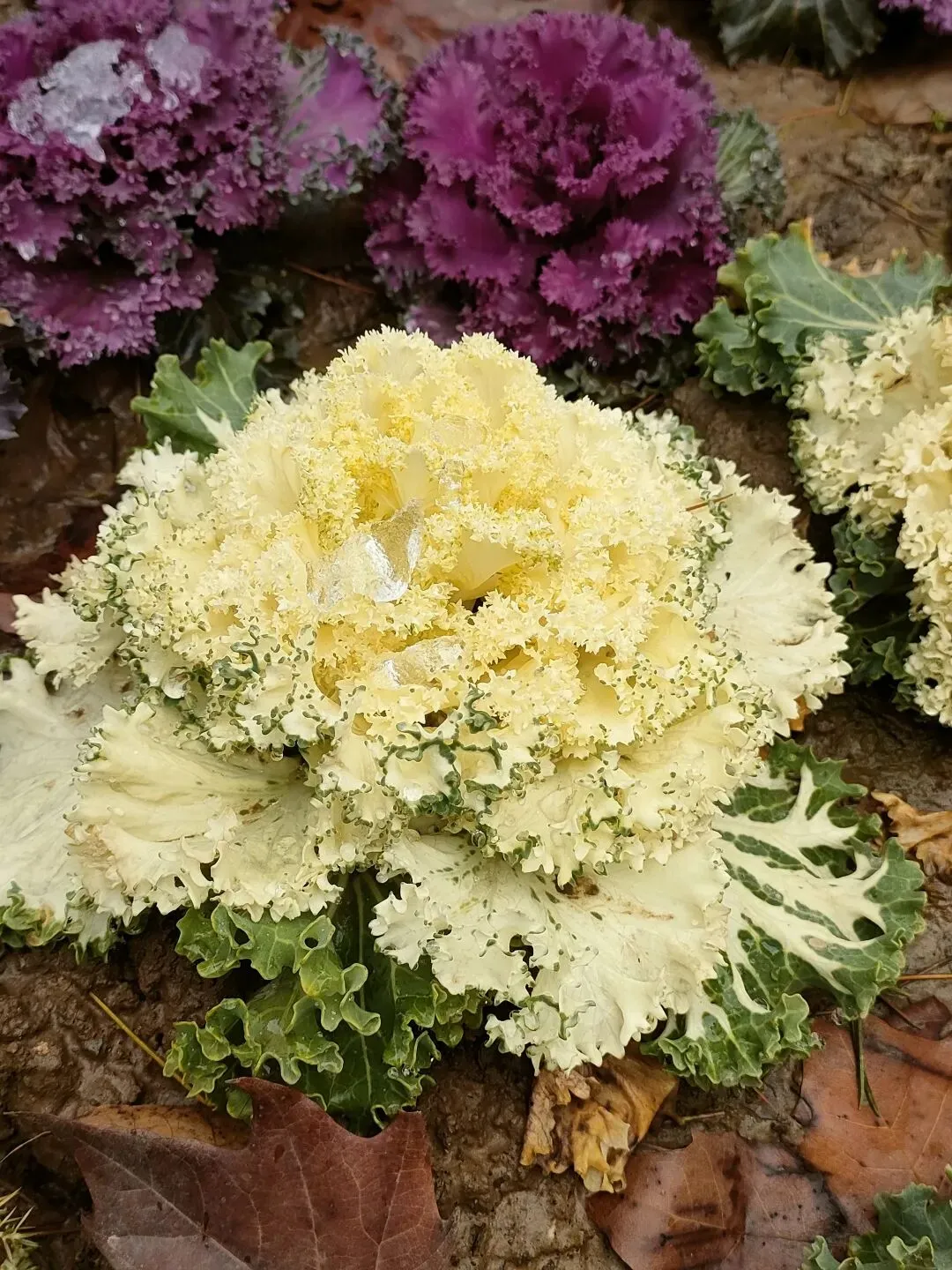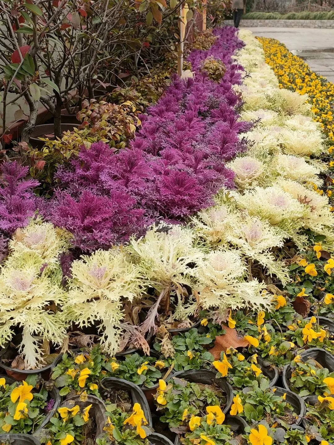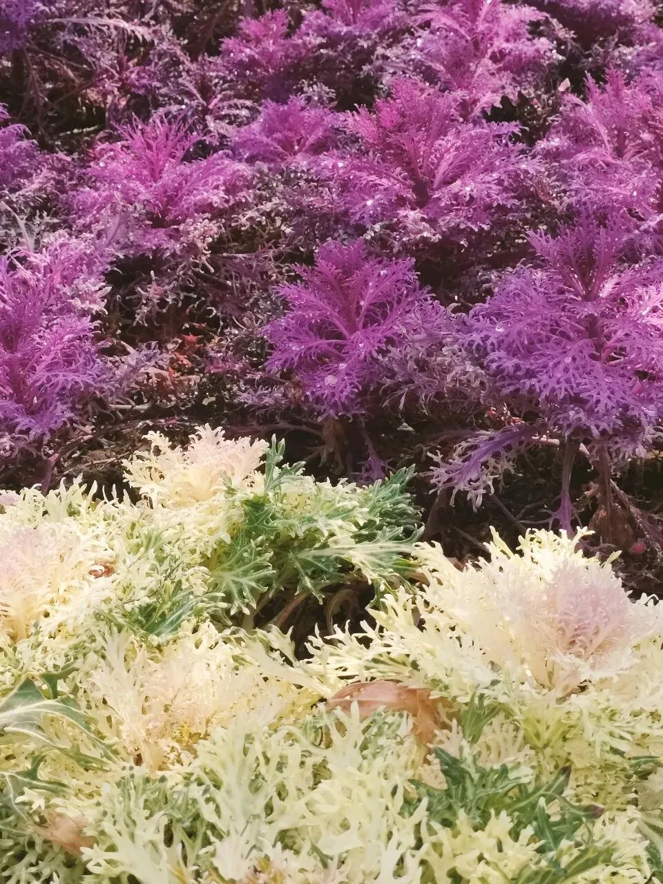 也叫做“叶牡丹”,公园里紫色、黄粉相间两种色彩,叶片呈卷曲的花状形态,煞是好看。