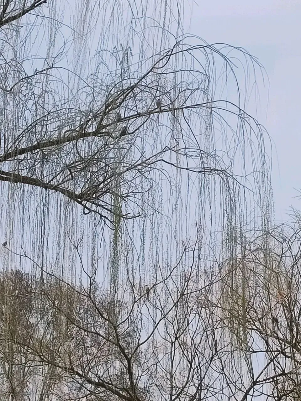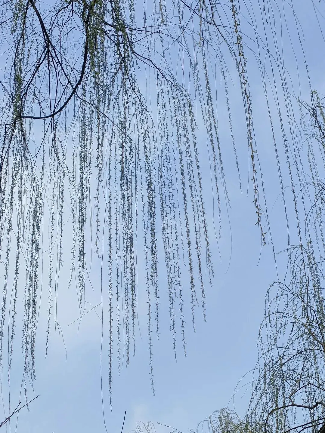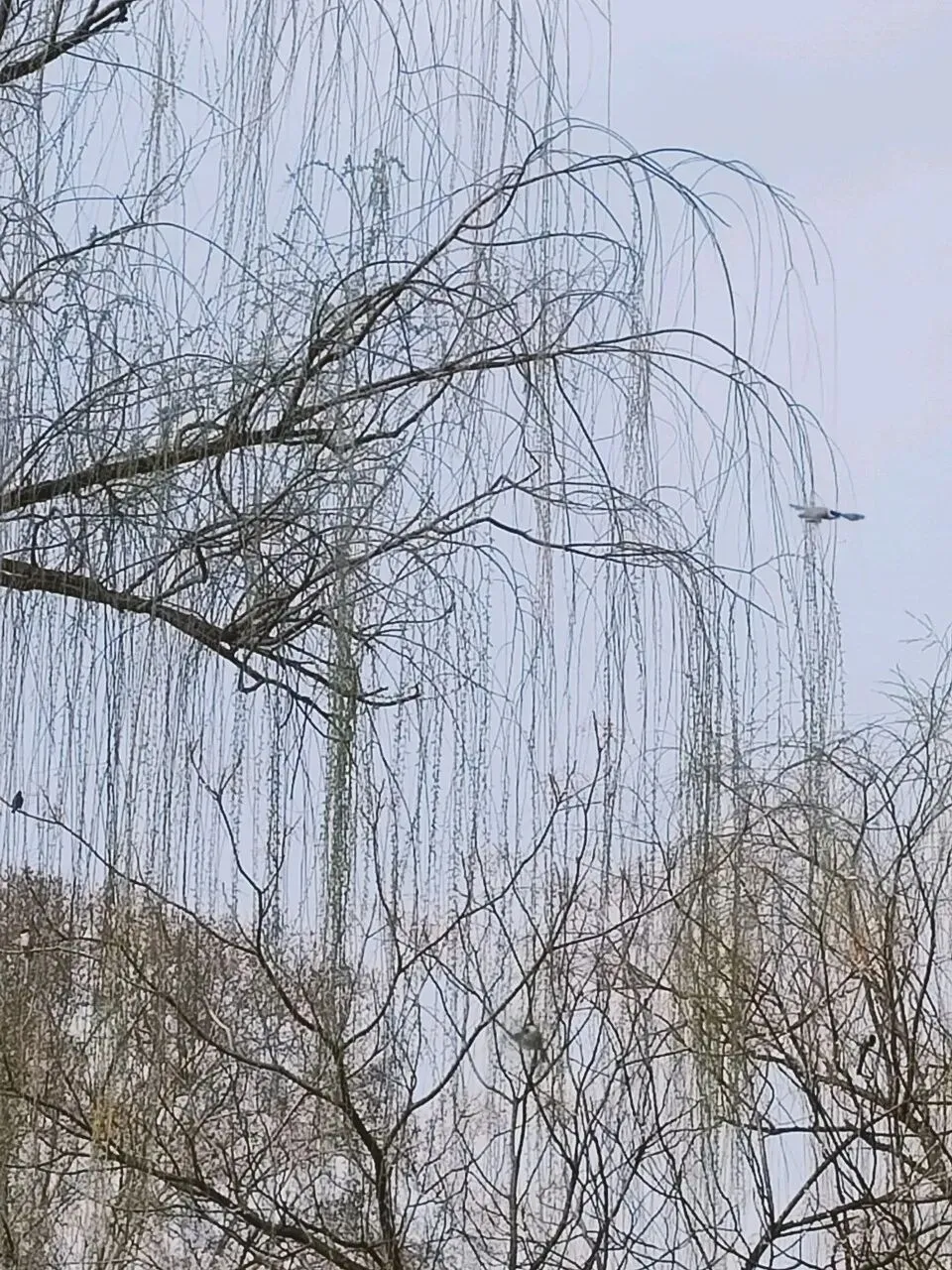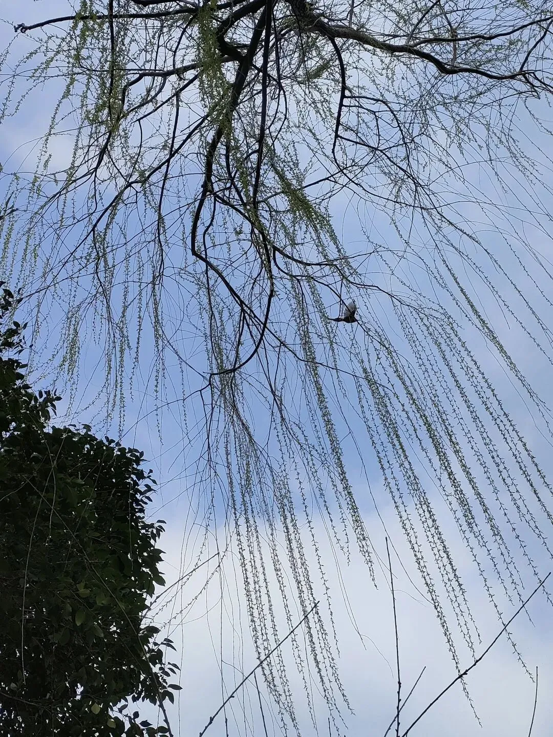 杨柳依依,如帘似烟,不时有鸟儿掠过,飞向蓝天。