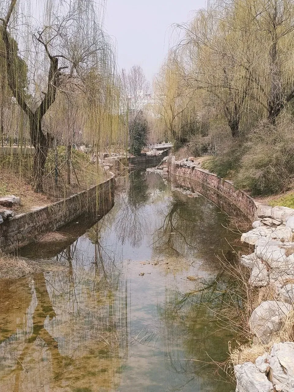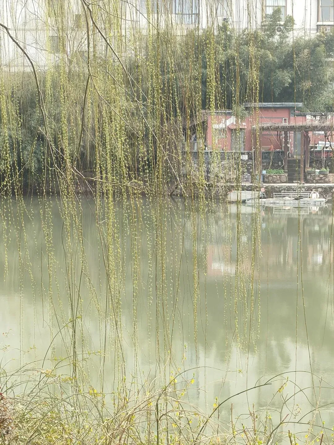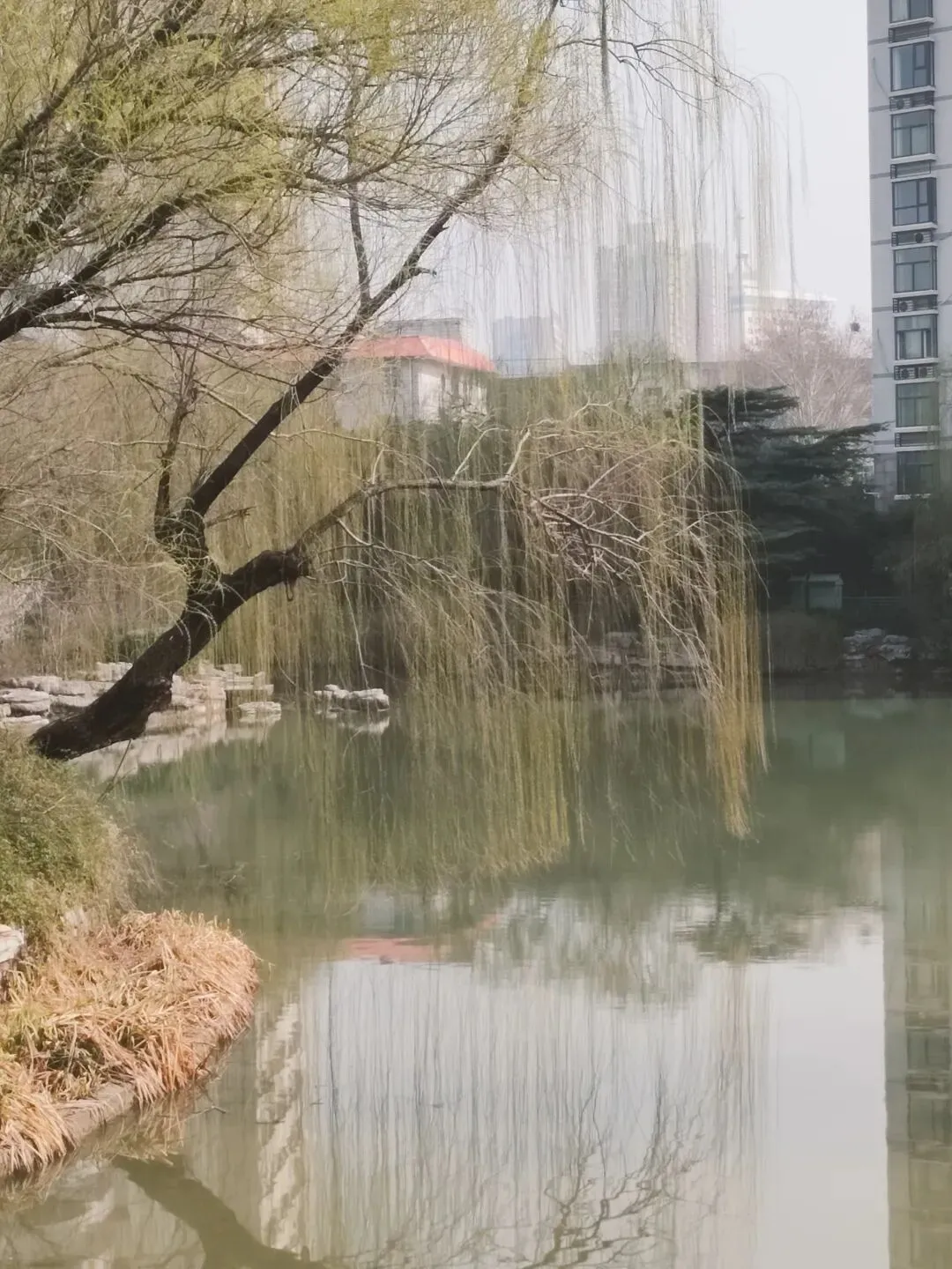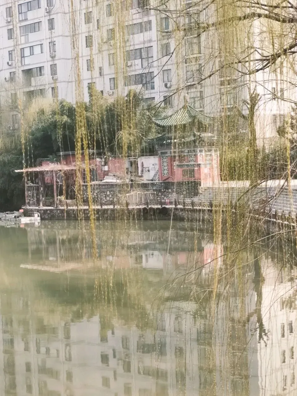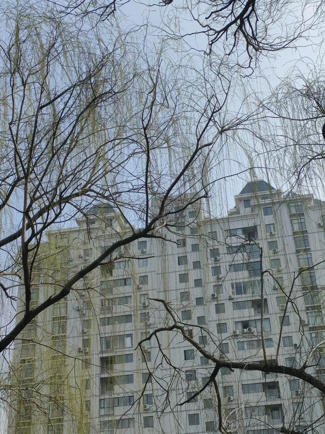 杨柳依依,如帘似烟,不时有鸟儿掠过,飞向蓝天。