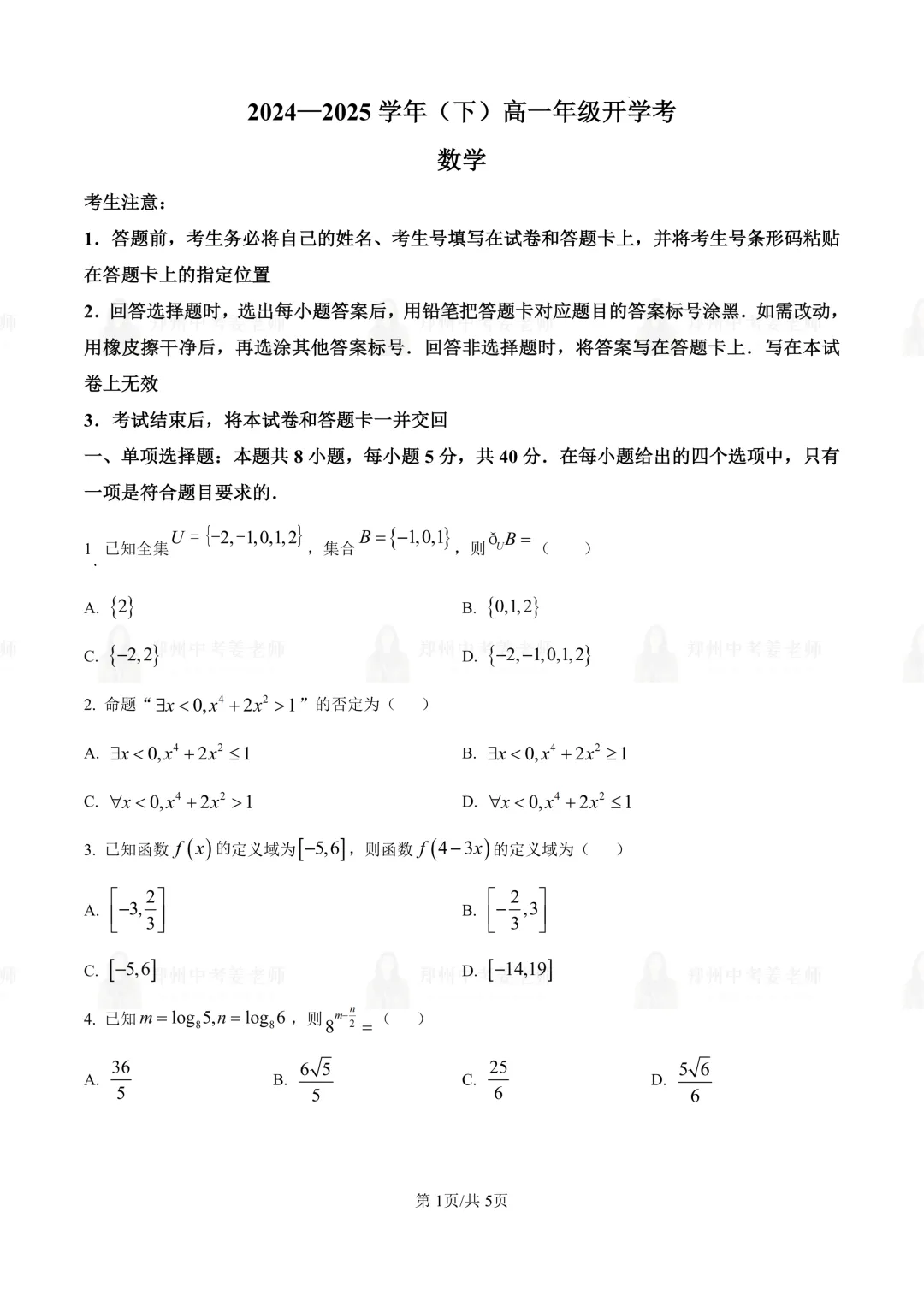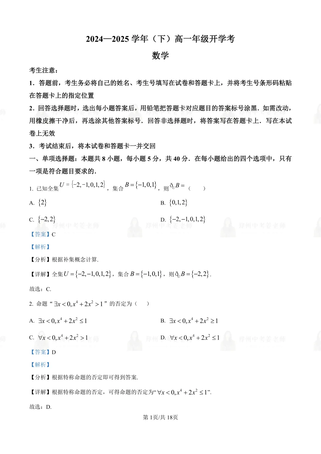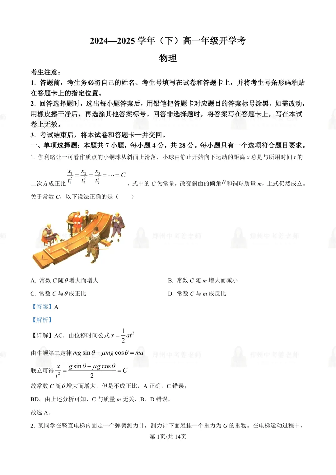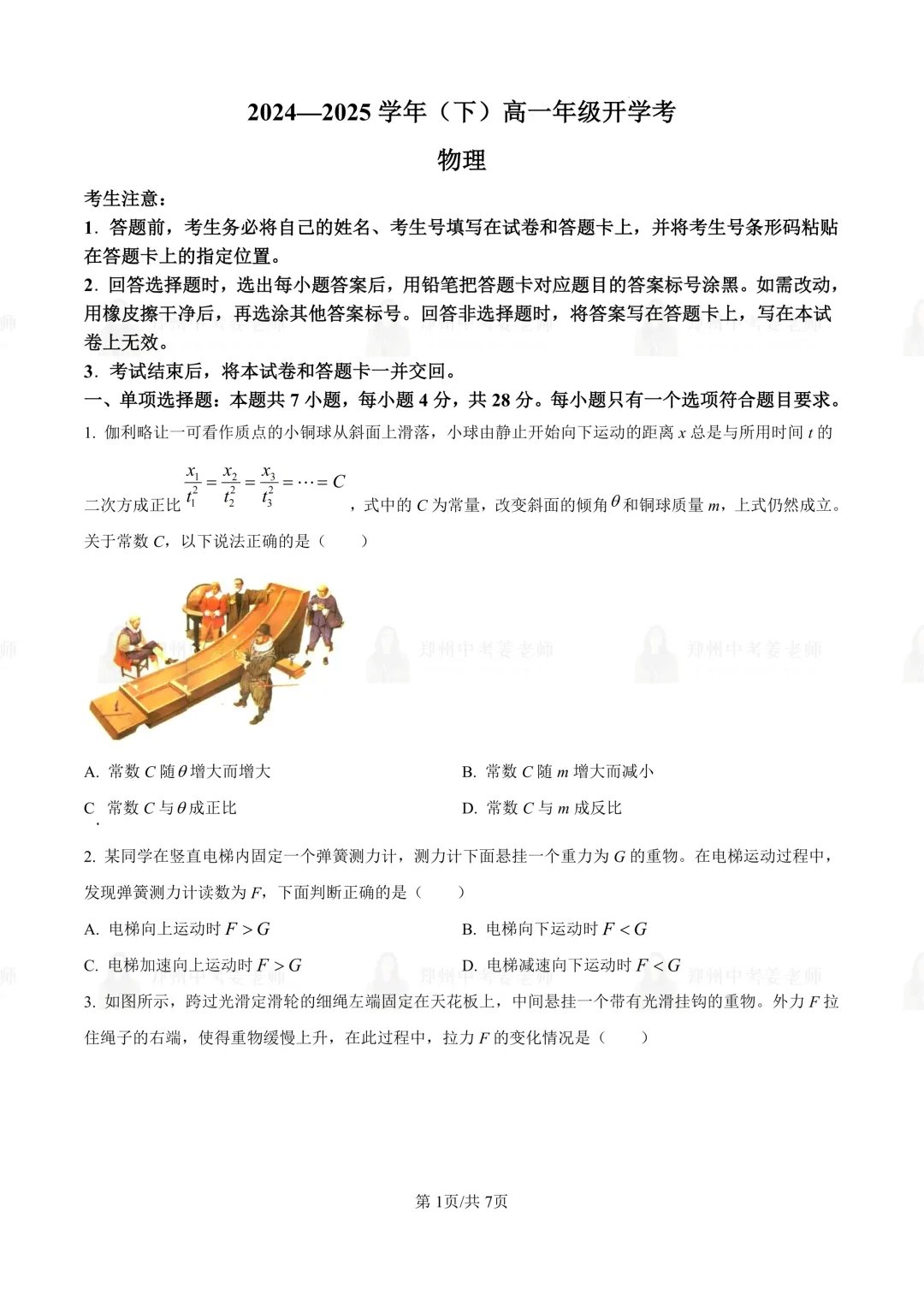 >【9科全】郑州部分高中2024-2025学年高一下开学考真题及答案