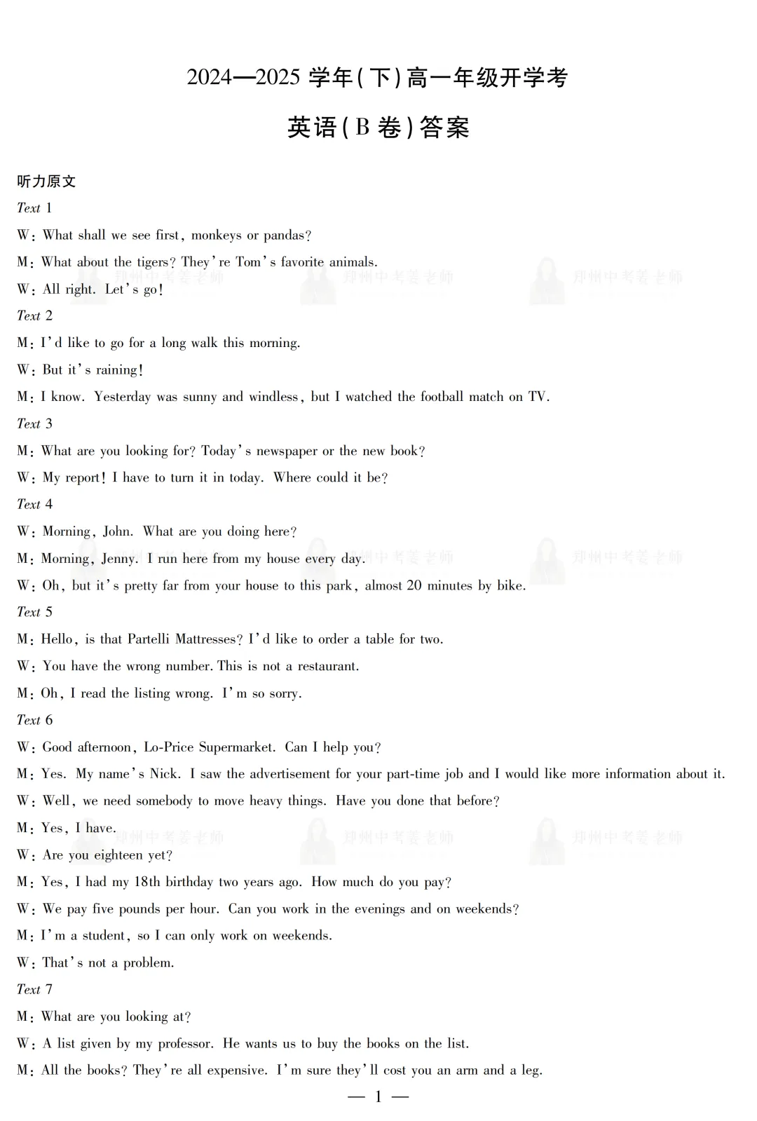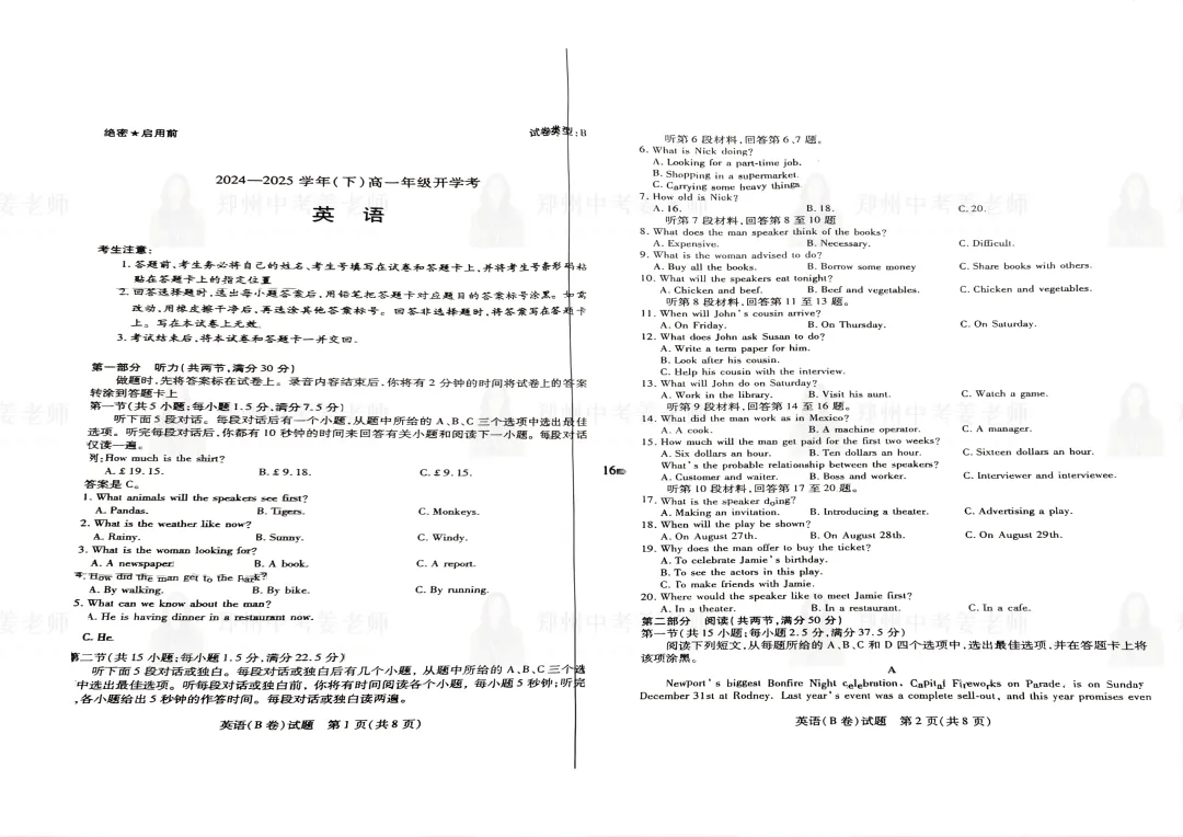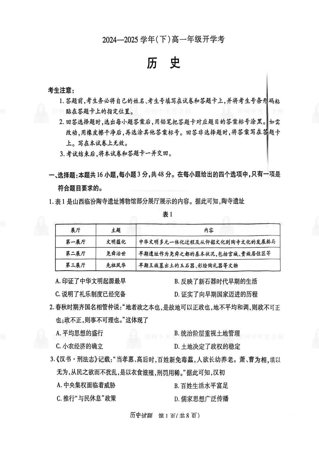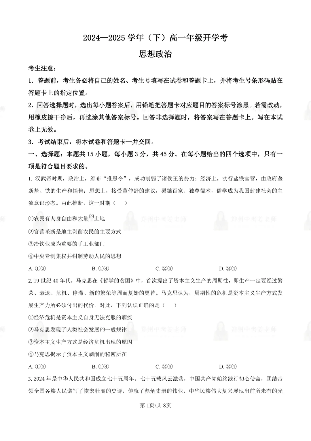 >【9科全】郑州部分高中2024-2025学年高一下开学考真题及答案