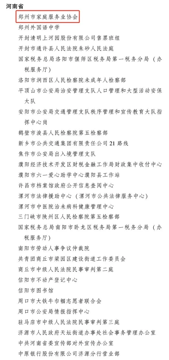 3月2日,全国妇联在京举行纪念“三八”国际妇女节暨表彰大会。大会表彰了9名全国三八红旗手标兵、598名全国三八红旗手、400个全国三八红旗集体、600个全国巾帼文明岗。郑州市家庭服务业协会荣耀上榜,荣获全国巾帼文明岗。
